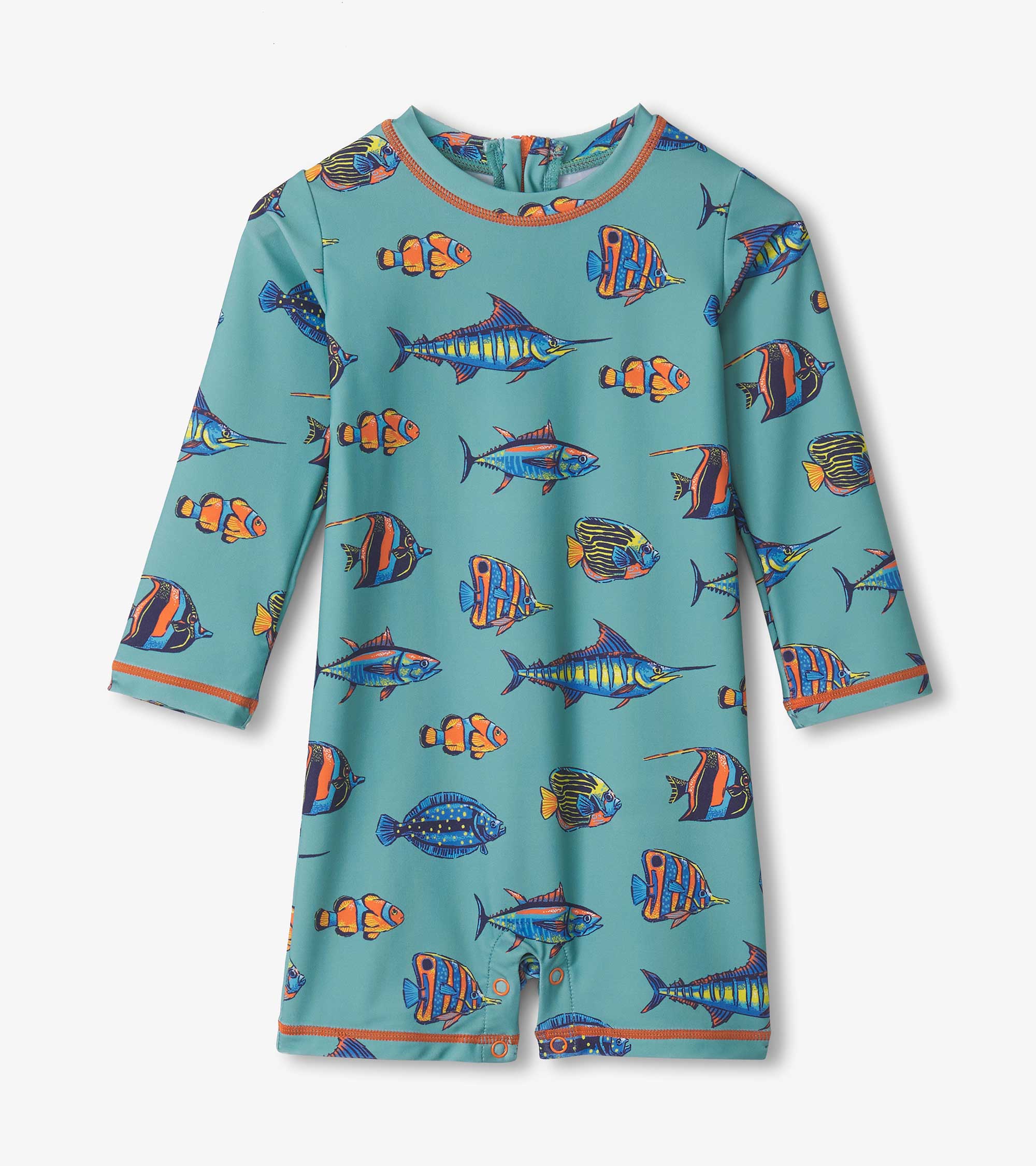 Help your little one ride the tide in our baby boys tropical fish one-piece rashguard! This nile blue swimsuit features cinched leg openings, a zipper on the back, fuchsia purple bows on the leg openings, and an all-over blue and orange tropical fish design with orange stitching. Perfect for keeping your guppy stylish and protected on their next beach outing!
