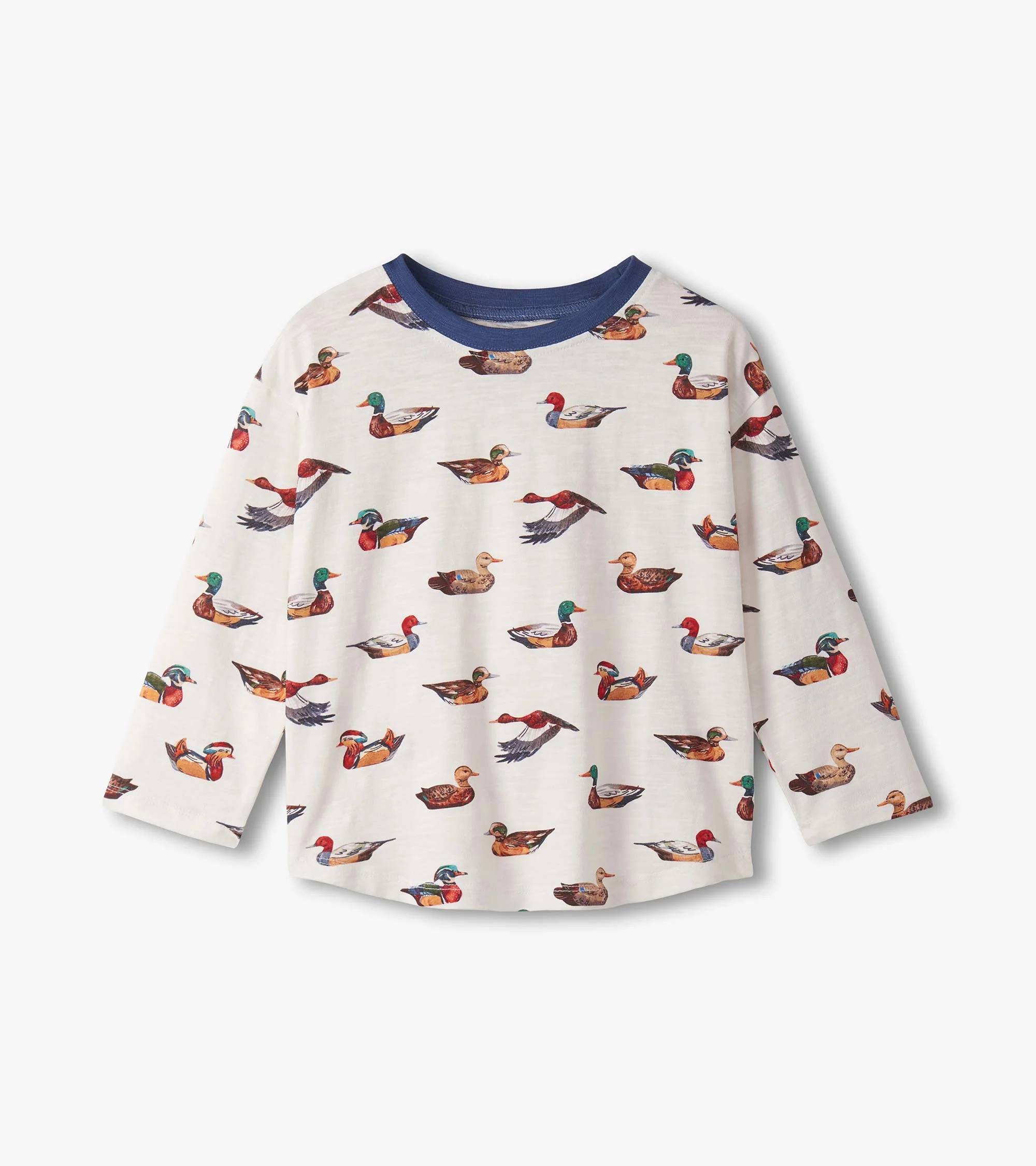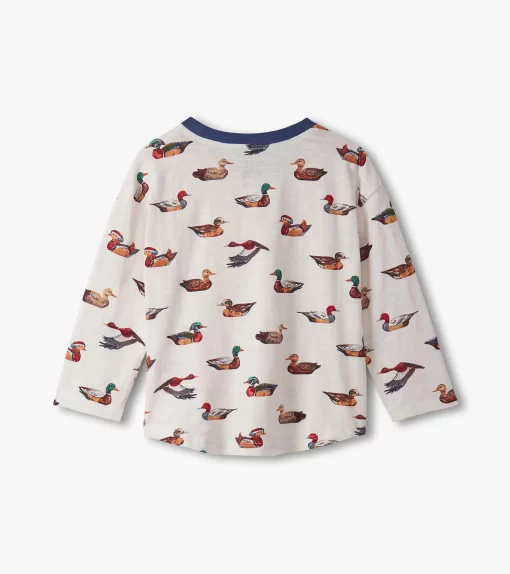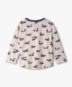 Help his imagination take flight in the Baby & Toddler Boys Duck Decoys Graphic Lounge Set in Natural, a cozy, nature-inspired outfit perfect for playtime or downtime. The heathered off-white long sleeve t-shirt features a navy blue crew neck and an all-over print of multicoloured ducks, bringing a splash of outdoor charm to his wardrobe. Paired with heathered navy blue sweatpants made from a soft, flexible cotton blend, this set is designed for all-day comfort. With a functional white drawstring and roomy front patch pockets, it blends practical details with playful style.