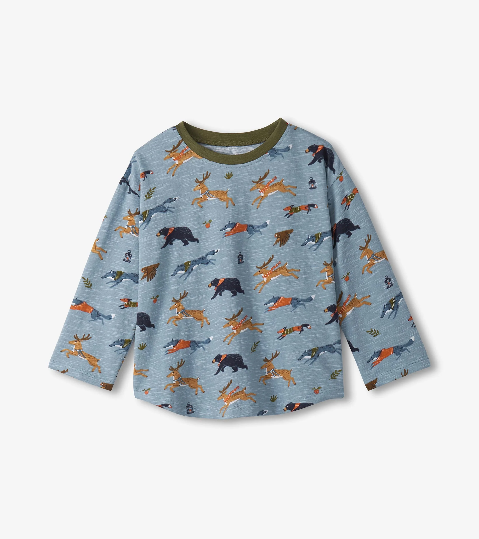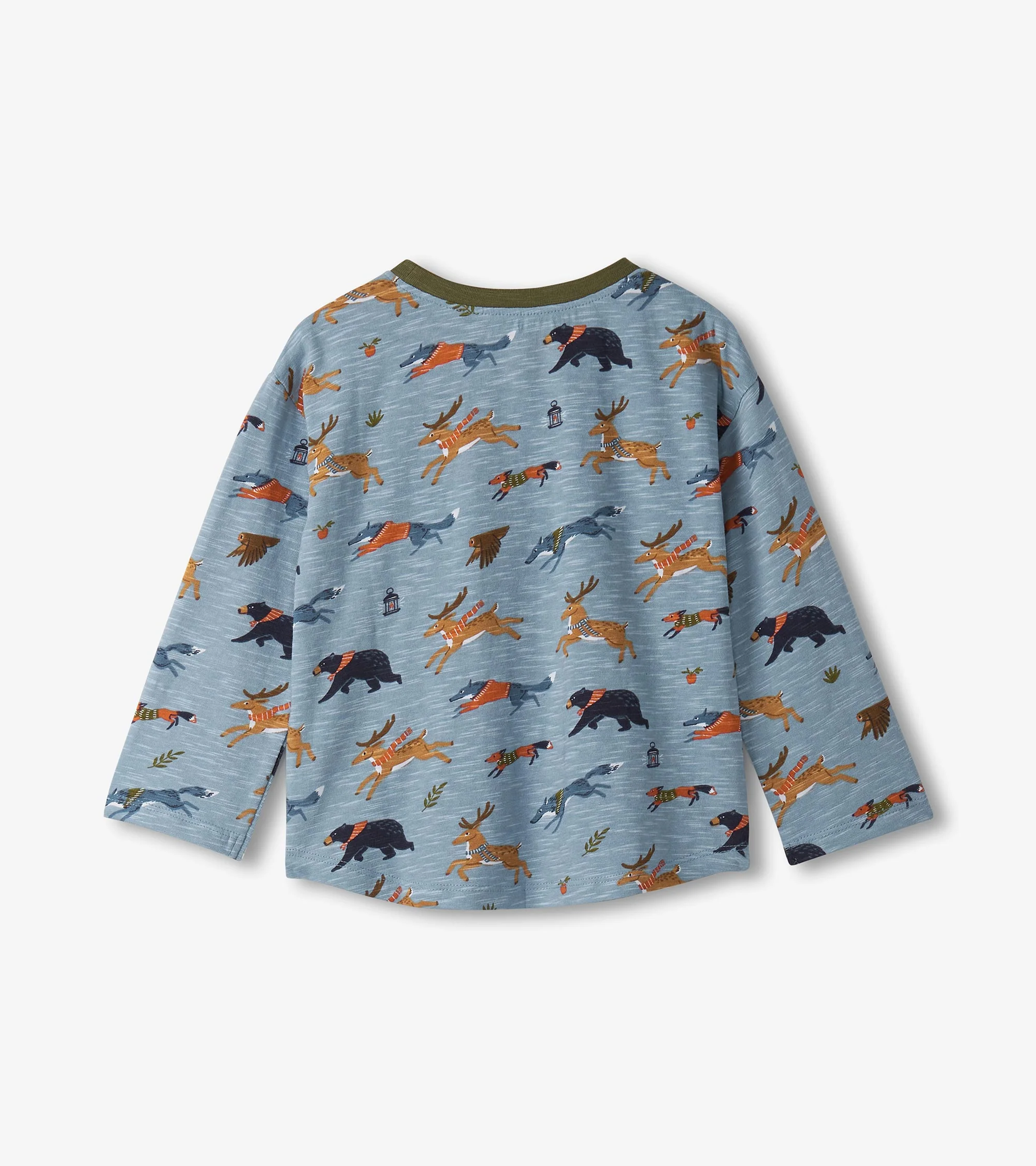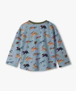 Let his wild side roam free in the Baby & Toddler Boys Forest Animals Graphic Lounge Set in Blue! The heathered light blue long sleeve t-shirt features a soft olive green crew neck and an all-over print of colourful forest animals, bringing the outdoors to his everyday adventures. Made from a comfy, stretchy cotton blend, the matching olive green sweatpants include a functional white drawstring, cuffed ankles, and handy slash pockets for little treasures.