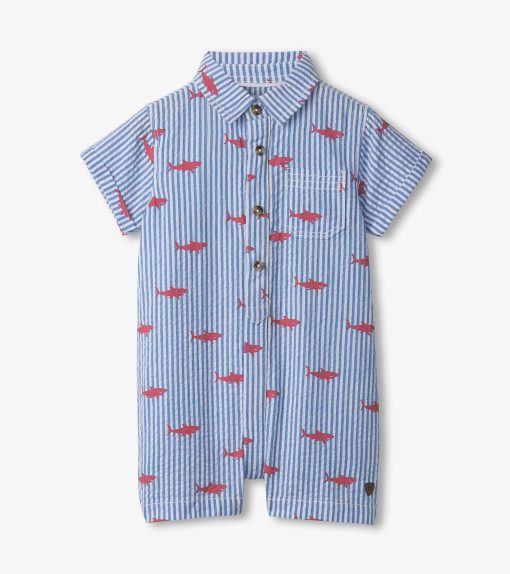 Dive into summer fun with the Baby & Toddler Boys Shark Silhouette Woven Romper! Made from soft, breathable cotton, this romper is perfect for splashy adventures or sunny strolls. The playful shark print will make your little one the star of every seaside escapade!