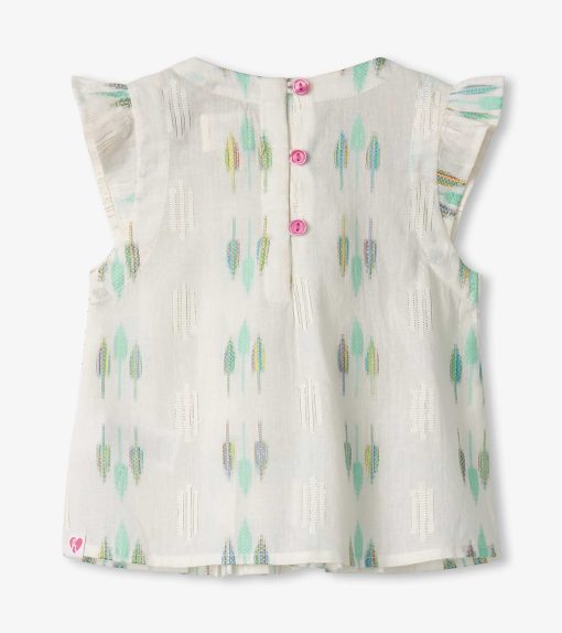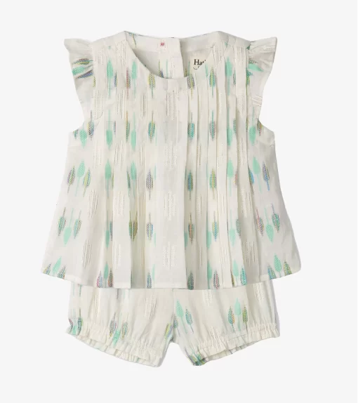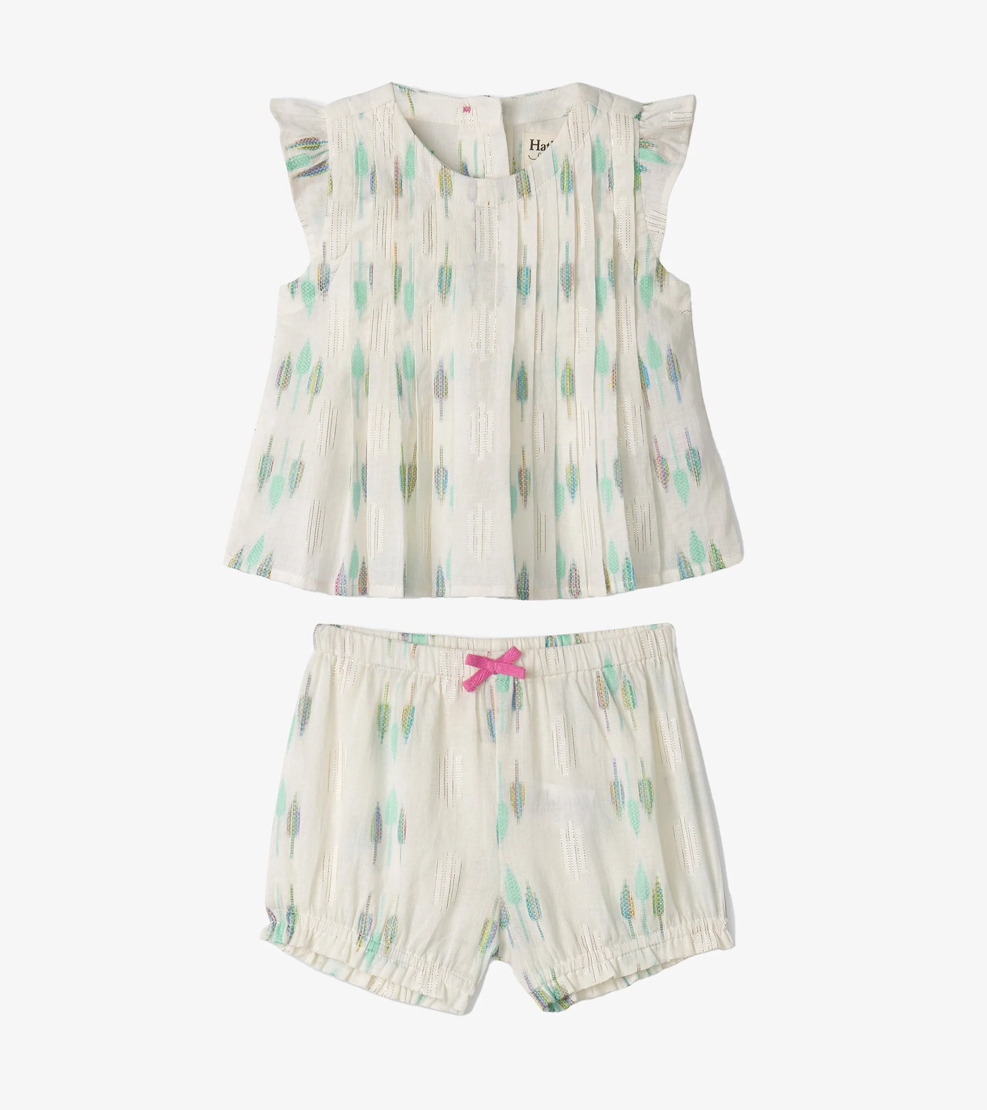 The Baby & Toddler Girls Blue Feathers Pin Tuck Top & Bloomer Set is pure elegance! Made from a blend of cotton, polyester, and metallic fiber, this set features delicate pin tuck details and shimmering feather patterns. The lightweight top and comfy bloomers make it perfect for special occasions or everyday charm. A stunning outfit for your little one!