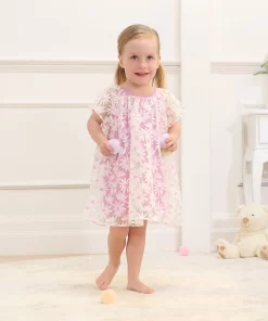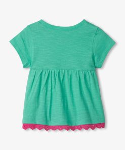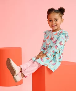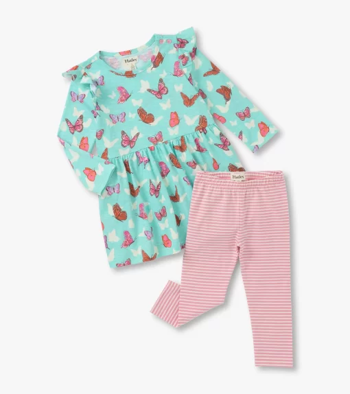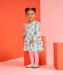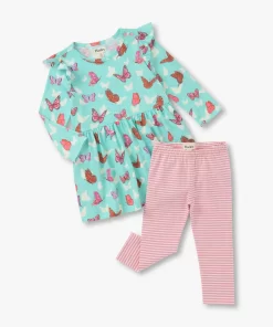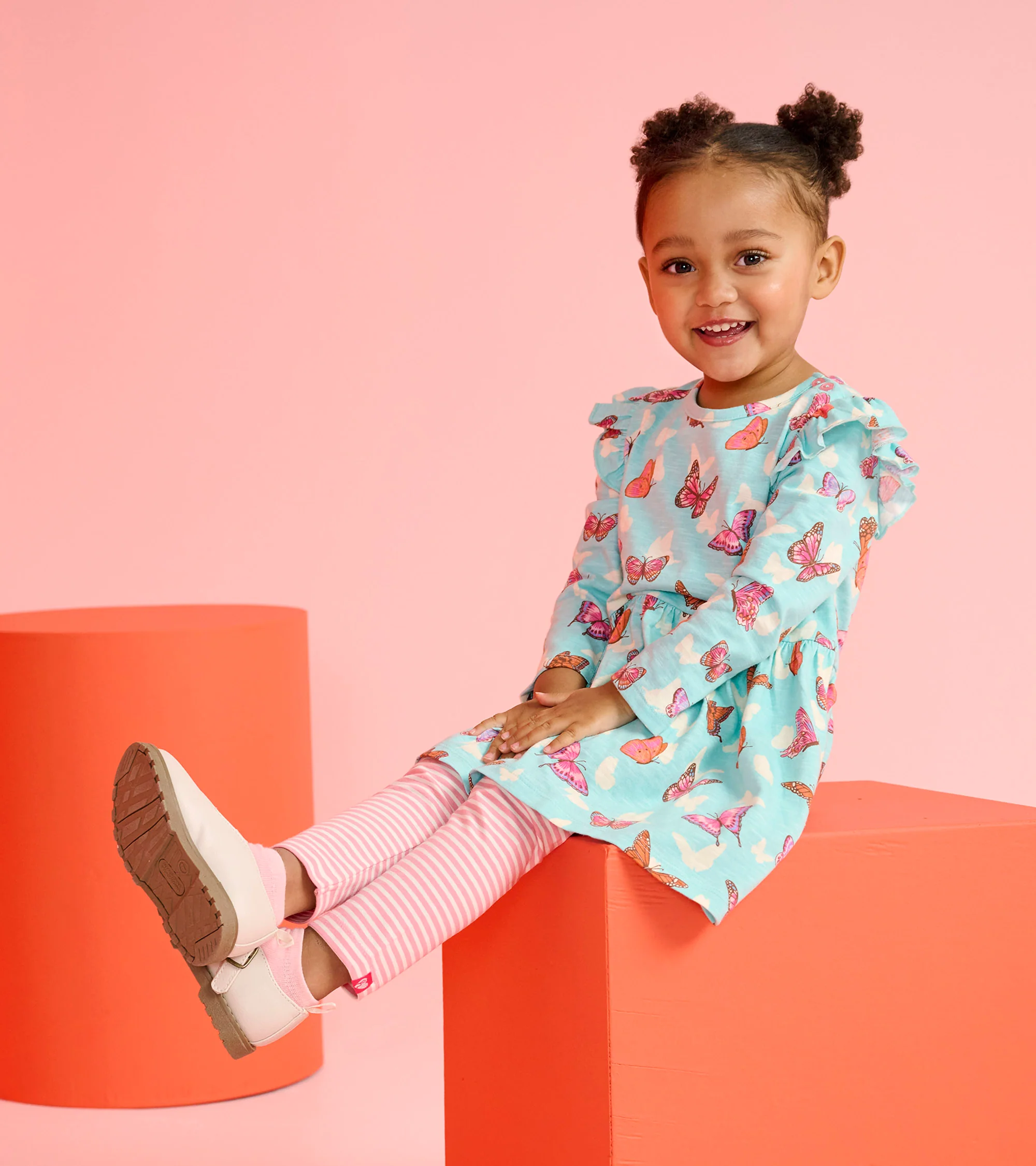 Let her flutter through the day in style with the Baby & Toddler Girls Butterfly Ruffle Dress and Legging Set in Green! This sweet outfit features a heathered pale turquoise dress with a classic crew neck, playful ruffled shoulders, and a pleated skirt for twirl-worthy volume. A two-button opening at the left shoulder makes dressing a breeze, while the all-over print of multicoloured and white silhouette butterflies adds a cheerful, whimsical touch. The coordinating pink and white striped leggings are crafted from a soft, stretchy cotton blend and feature an elastic waistband for all-day comfort.