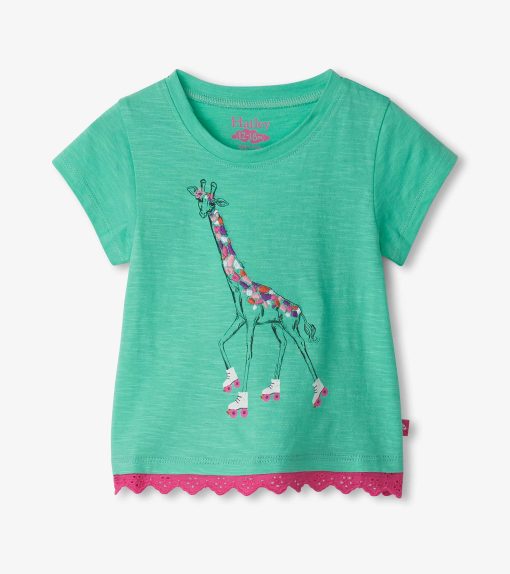Add a playful pop to her wardrobe with the Baby & Toddler Girls Green Giraffe Eyelet Trim T-Shirt! Crafted from soft cotton, this tee features a charming giraffe graphic and delicate eyelet trim. Lightweight and comfy, it’s perfect for sunny days or layered looks.