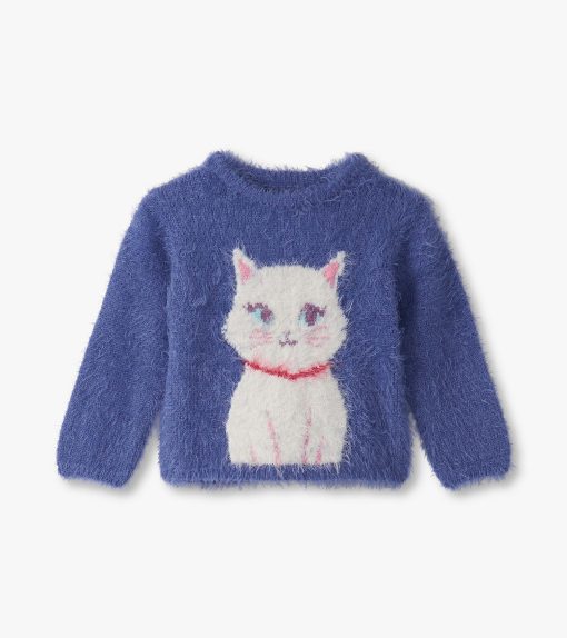 Cozy meets cute in the Baby & Toddler Girls Kitty Cat Furry Sweater in Blue! Made from a super soft and stretchy hairy nylon blend, this fuzzy long-sleeve sweater keeps her warm and comfy all day. The round neckline and plush texture offer an extra snuggly feel, while the charming design, a large white kitty knitted into the front with a fuchsia collar, turquoise and purple eyes, and pink whiskers, adds playful personality. Set against a soothing blue background, it’s a purr-fect piece for chilly weather with just the right mix of fun and flair.