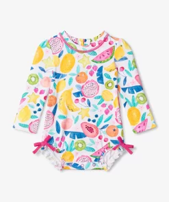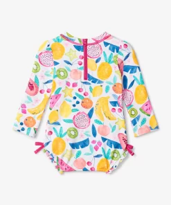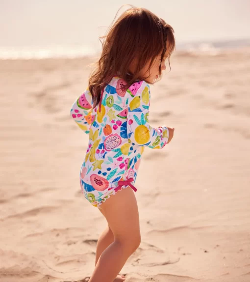With its endearing print and adorable ruffled leg openings, this long sleeve rashguard is the perfect choice for days at the beach! Featuring a UPF 50+ sun protection, a zipper closure on the back and a snap closure at the inseam (hello, easy diaper changes), it’s no wonder this rashguard is beloved by so many moms.