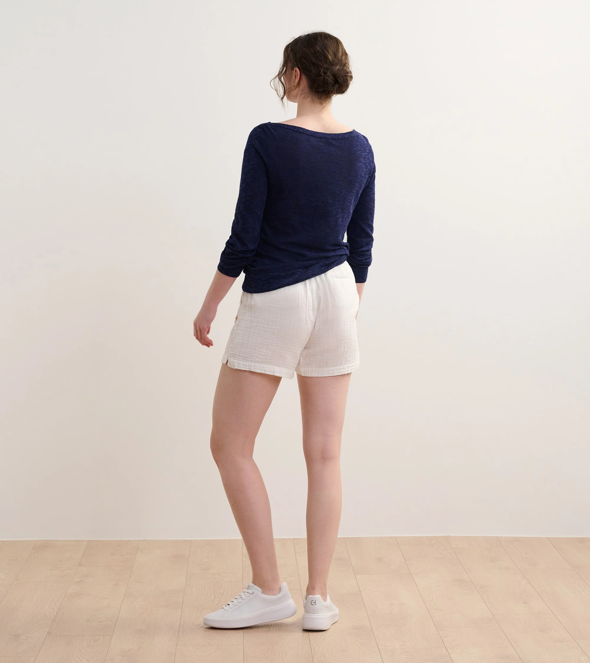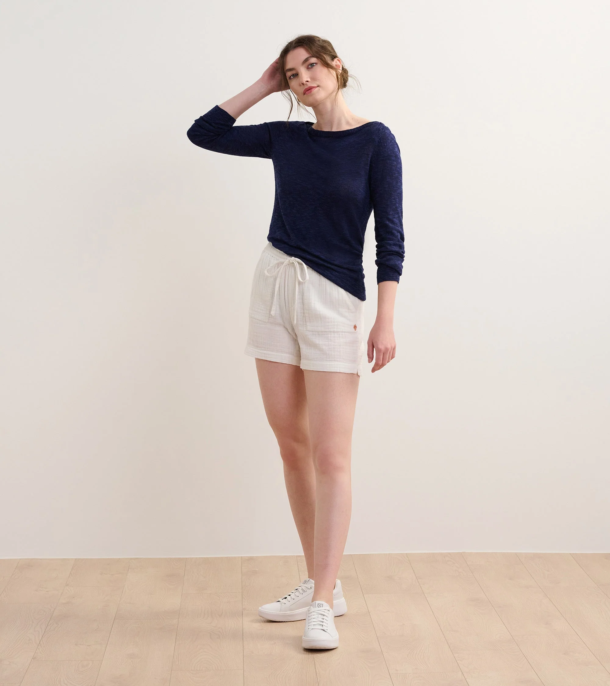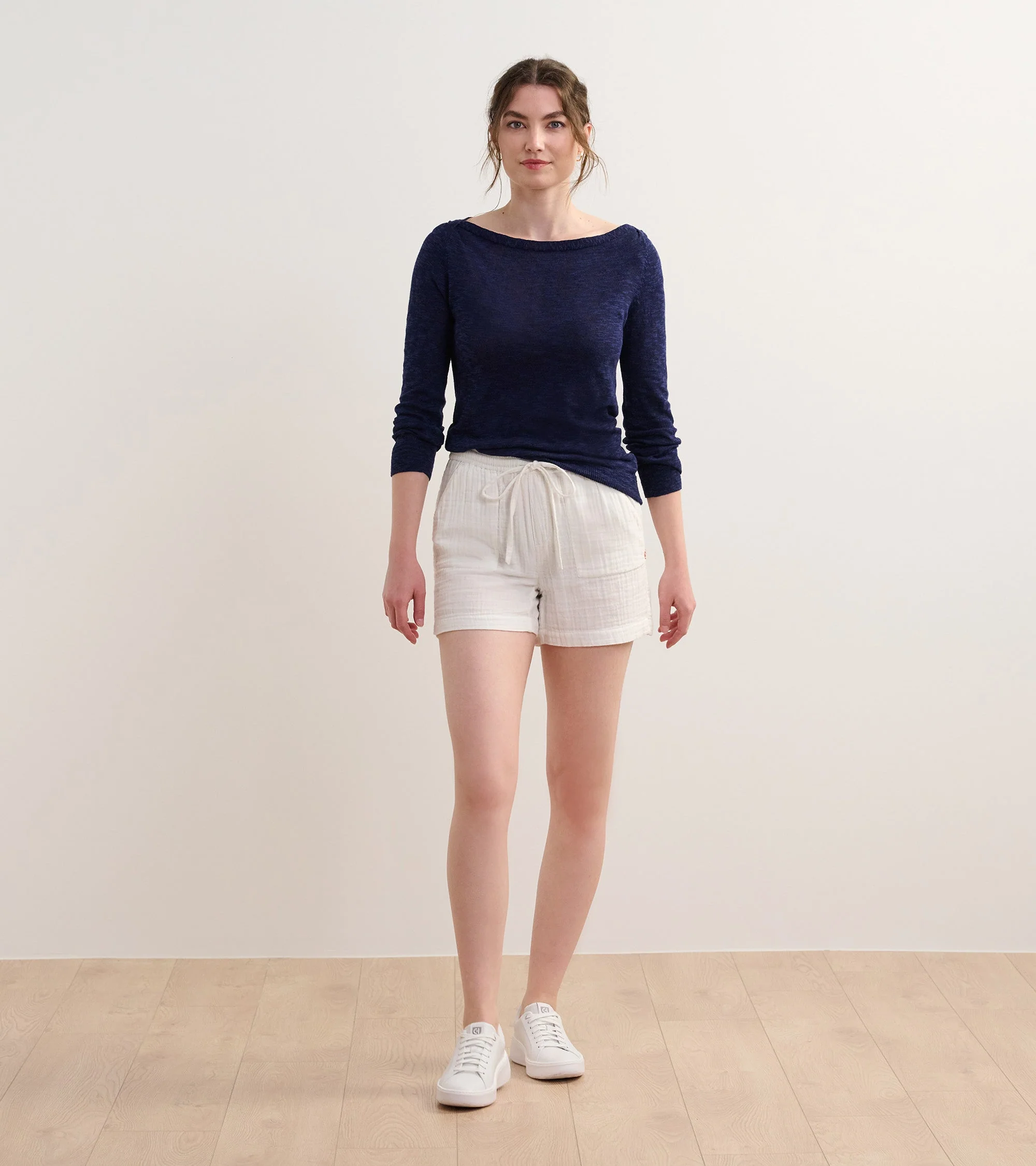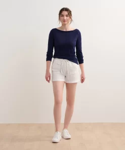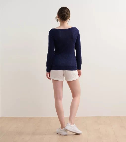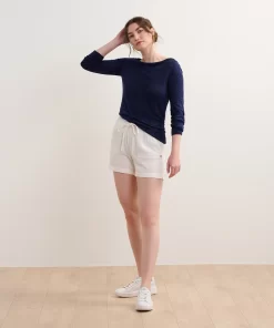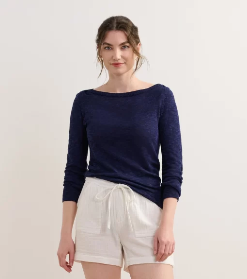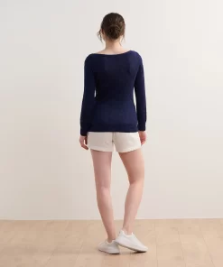 Our 3/4 Sleeve Knit Breton in Navy is a harmonious blend of traditional style and modern comfort. The mix of cotton and viscose offers a soft touch and a gentle stretch, perfect for a refined yet relaxed fit. The 3/4 sleeves add a touch of transitional elegance, suitable for both crisp mornings and warm afternoons.