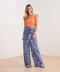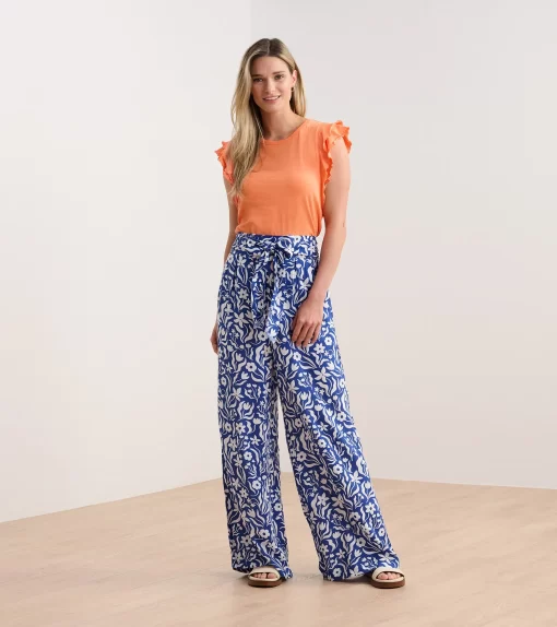 The Belted Wide Leg Pants in Wavy Flowers combine comfort and modern elegance. Crafted from soft rayon, they feature a wide-leg silhouette, smocking on the back waist, front slash pockets, inverted box pleats, and a stylish tie front. The floral-inspired wavy pattern adds a creative flair, making these pants a standout piece. Style them with a simple neutral blouse for an effortlessly chic ensemble.