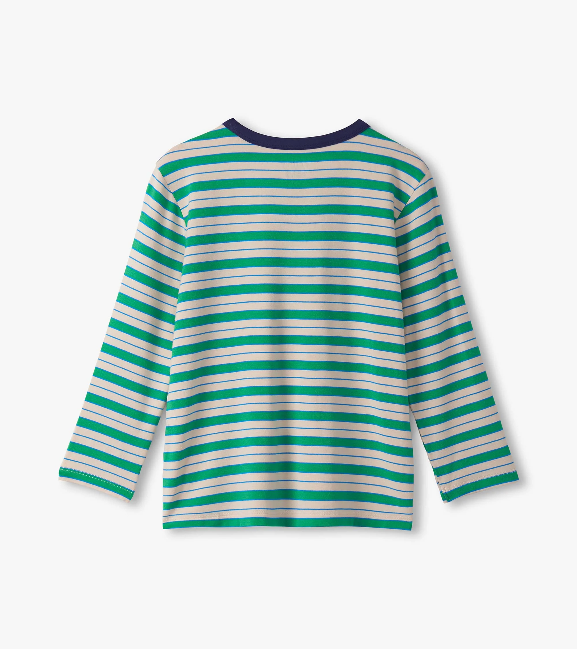 The Boys Blarney Stripes Long Sleeve Bamboo T-Shirt in Green is a stylish essential made from a soft, eco-friendly bamboo blend that keeps kids cool and comfortable all day. Featuring a refreshing green background accented with beige and thin blue stripes, this shirt stands out with a dark blue crewneck and matching patch pocket on the chest.