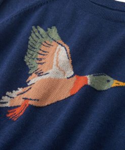 Wrap your little one in warmth and whimsy with the Boys Duck Crew Neck Sweater in Blue! Crafted from 100% soft cotton yarn, this long raglan-sleeve knit features a charming flying duck design knitted into the torso, set against a rich dark blue background. The classic crew neck and elastic cuffed wrists and hem offer a snug, cozy fit.