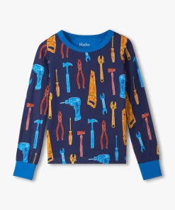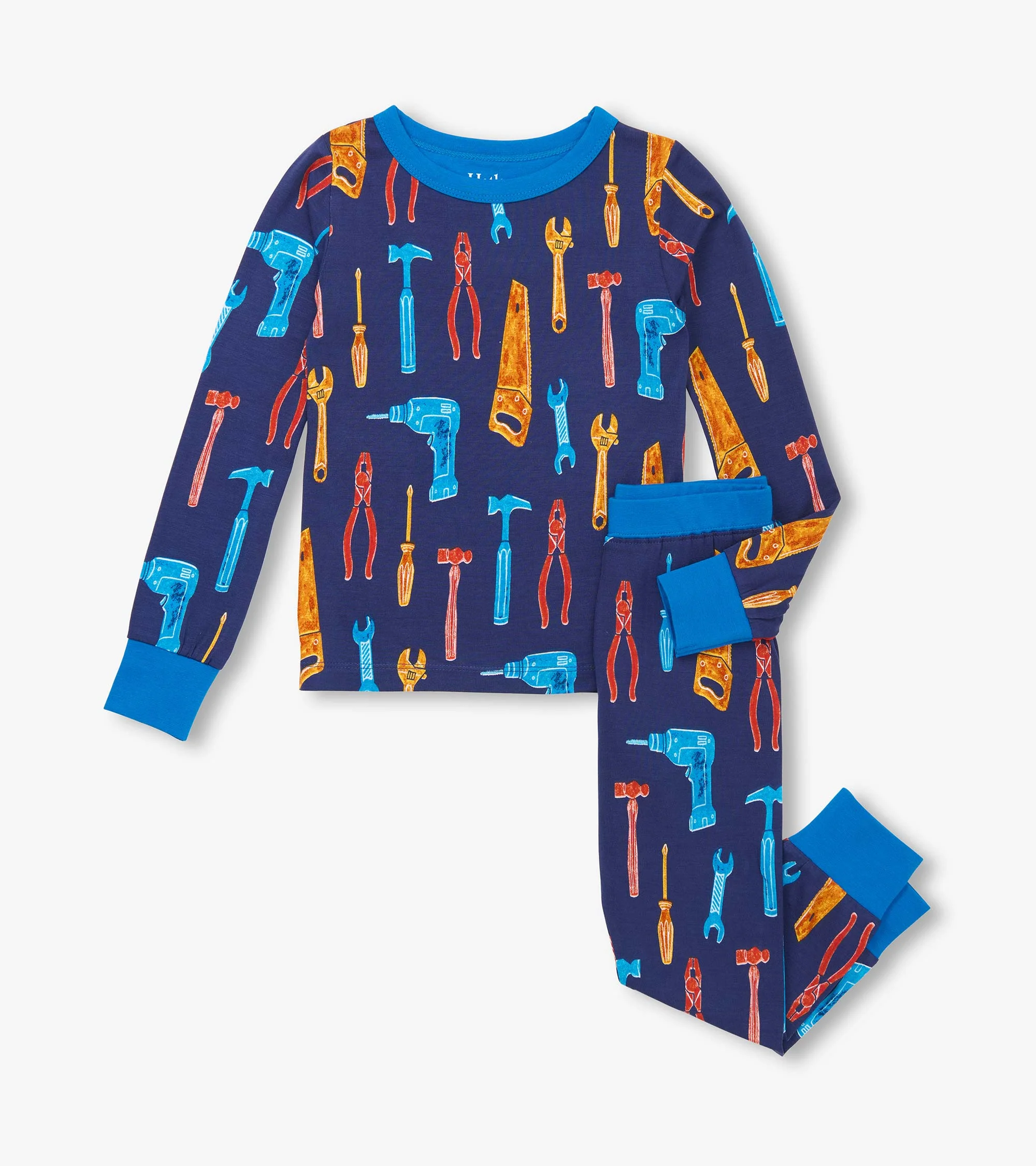 The Boys Lots of Tools Bamboo Pajama Set in Blue is built for comfort and little builders alike. Made from ultra-soft stretch bamboo fabric, this cozy 2-piece set features a snug crew neck top and full-length bottoms with a flexible elastic waistband. The dark blue base is brought to life with an all-over print of colourful orange, blue, and red tools, perfect for kids who dream in DIY. Finished with matching blue cuffs at the wrists, ankles, and waist, these pajamas are as functional as they are fun, delivering breathable softness all night long.