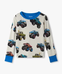 The Boys Mega Monster Trucks Bamboo Pajama Set in Natural delivers bedtime excitement with unmatched comfort. Crafted from luxuriously soft stretch bamboo fabric, this 2-piece PJ set features a natural background covered in bold, grainy blue, red, and green monster trucks. Designed for comfort and movement, it includes a wide elastic waistband, cuffed wrists and ankles, and a matching blue neckline and trims. With long sleeves and full-length bottoms, it’s a cozy, cool choice for every little truck enthusiast ready to power down in style.