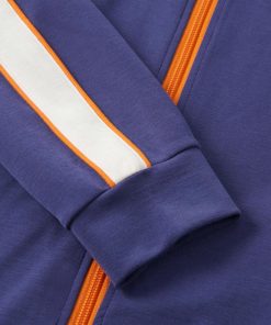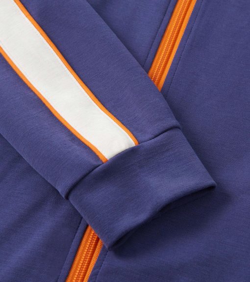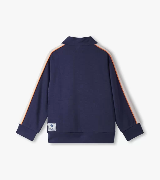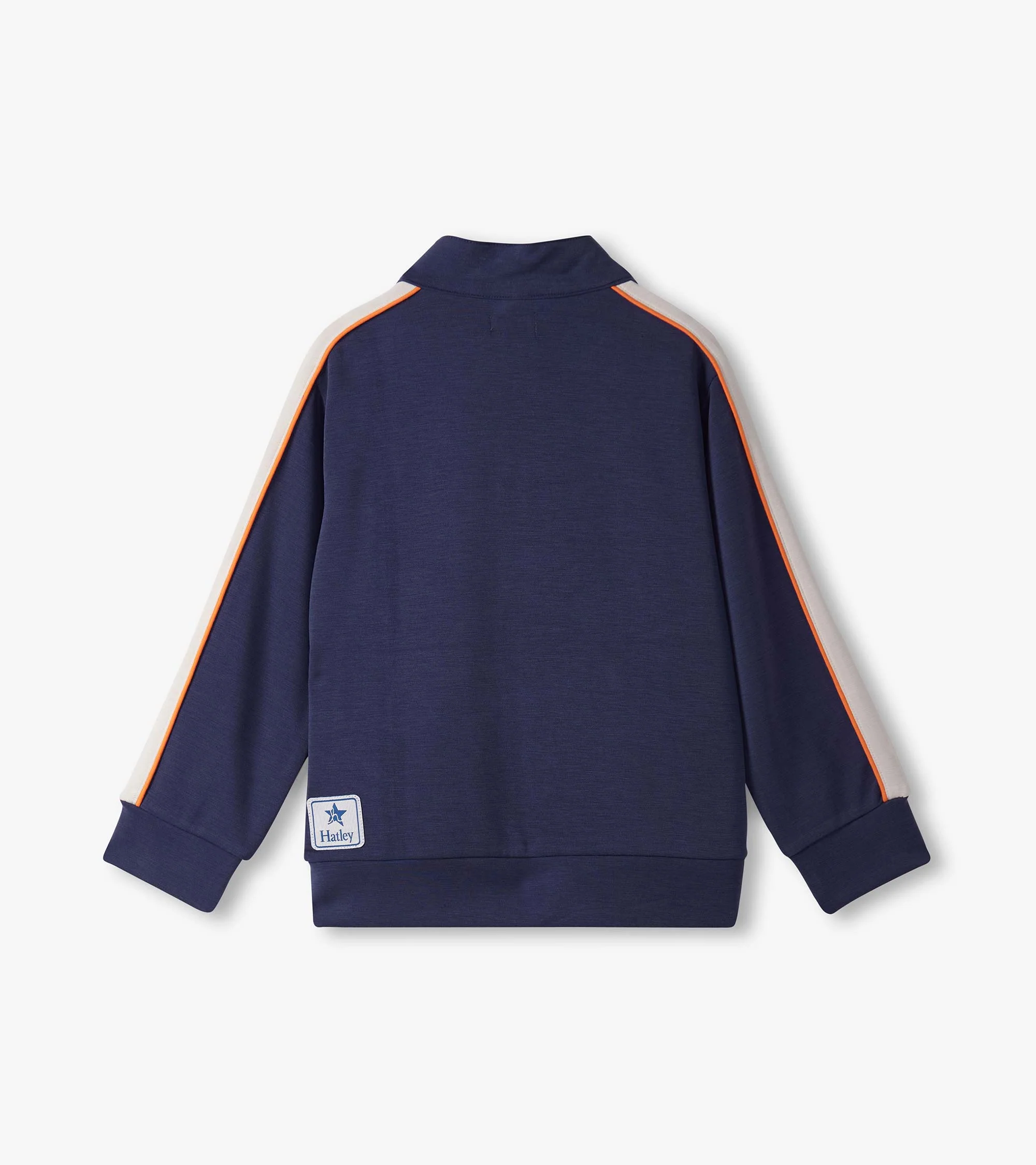 The Boys Navy Mockneck Jacket in Blue combines sporty flair with comfort in a soft, sandwashed stretch jersey made from a rayon-polyester-spandex blend. With long sleeves, cuffed wrists and hem, a two-piece collar, and a bold white arm panel outlined in orange, it delivers standout style. The exposed orange zipper adds a pop of colour, while angled front welt pockets and a stitched white Hatley logo on the back complete the design. Lightweight and flexible, it’s made for boys on the move, offering both function and flair.