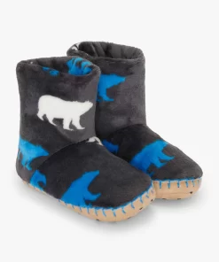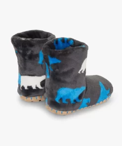 Keep his toes toasty in the Boys Polar Bear Silhouette Fuzzy Fleece Slippers in Grey! Made from ultra-soft 100% polyester fleece, these slouchy dark shadow slippers showcase an all-over blue and white polar bear silhouette pattern with contrast blue whip-stitch edging. A micro suede sole and black grip dots on the bottom make for secure and comfy indoor adventures.