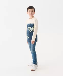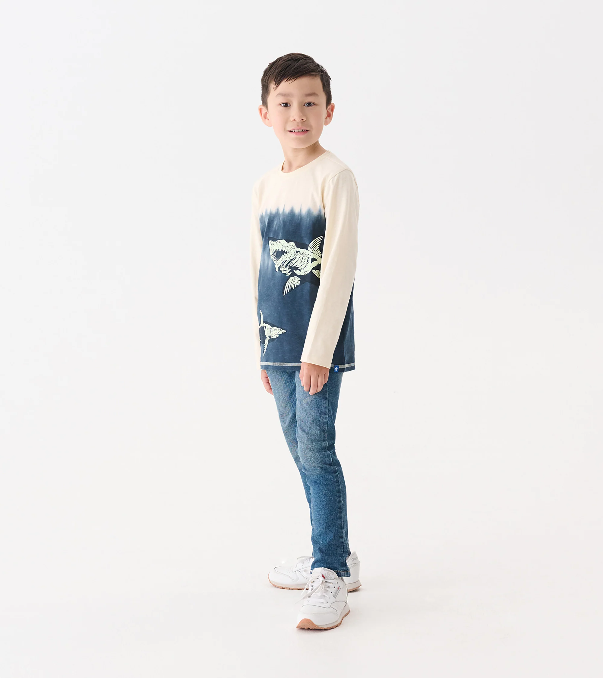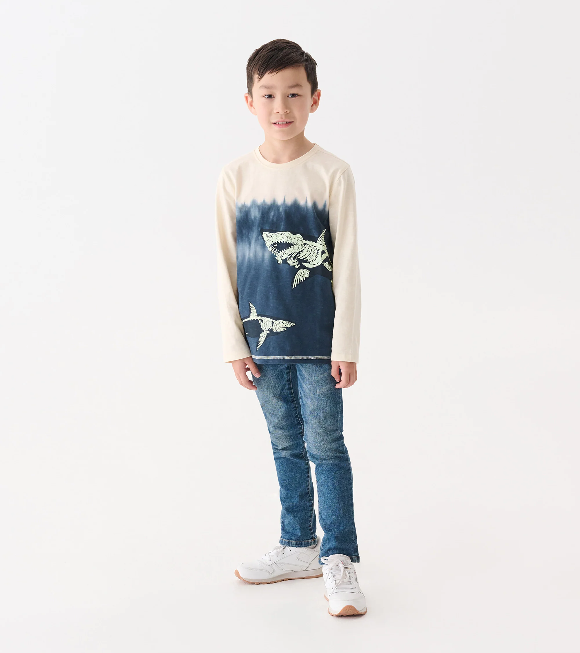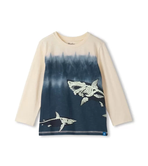 Dive into cool style with the Boys Shark Bones Long Sleeve Graphic Tee. Made from 100% cotton, this comfy crew neck tee features a sea-to-sand gradient with beige stitching and glow-in-the-dark shark skeletons swimming across the deep blue. Designed for everyday adventure, it blends fun graphics with all-day breathable comfort.