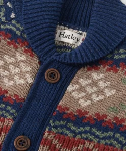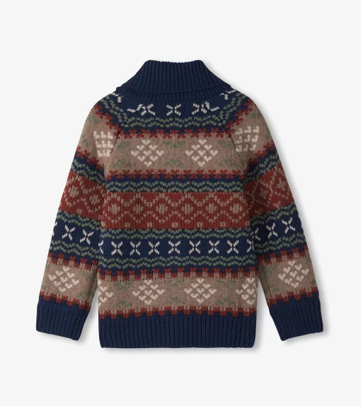 Give his winter style a vintage twist with the Boys Vintage Fair Isle Shawl Collar Cardigan in Blue! Crafted from a soft cotton blend yarn, this cozy cardigan features a classic red, blue, white, and grey Fair Isle pattern with a timeless shawl collar. The rich dark blue accents at the collar, button placket, cuffs, and hem bring bold contrast, while the four brown buttons and elasticated cuffs offer snug comfort.