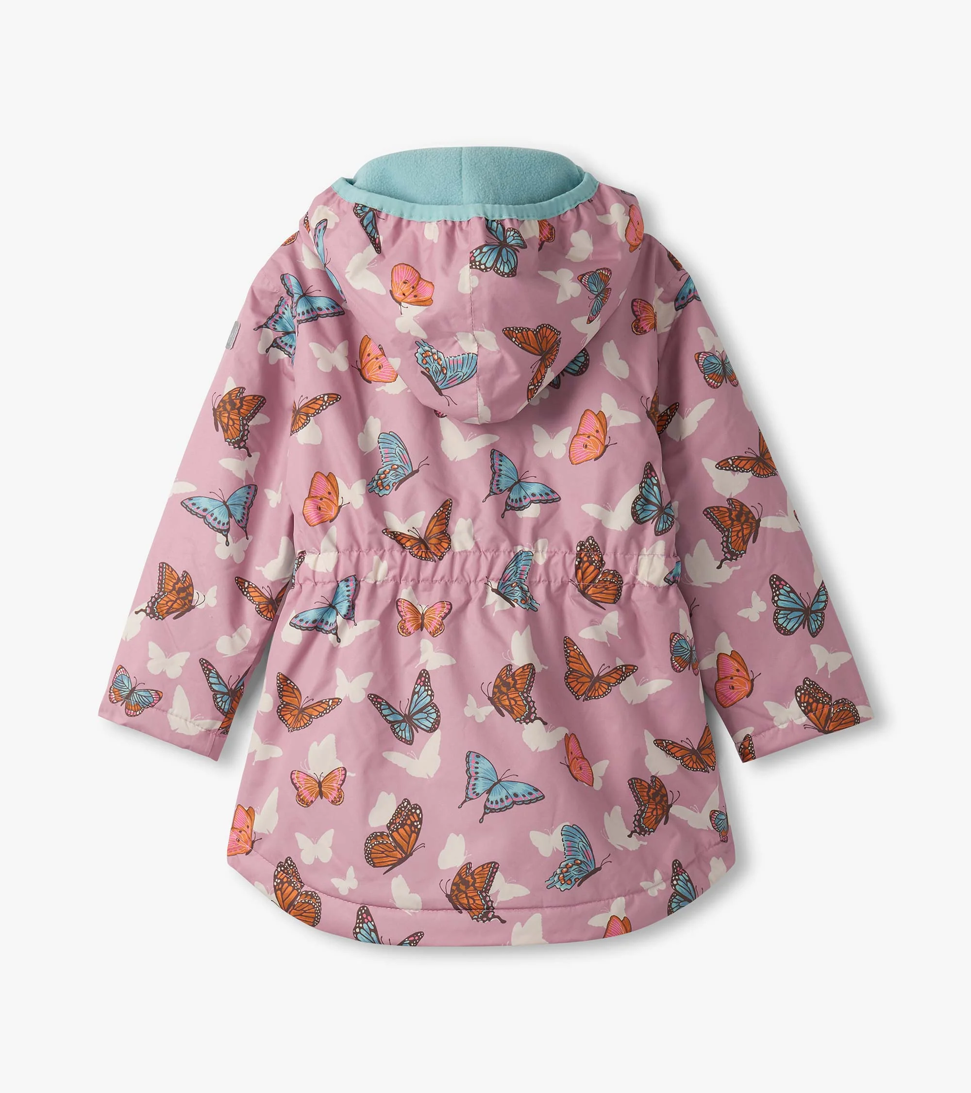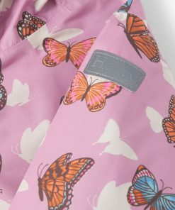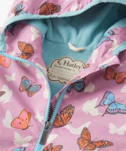She’ll flutter through rainy weather with the Girls Pop-Out Butterflies Zip-Up Lightweight Rain Jacket in Pink! The dark pink shell is adorned with a cheerful print of white and multicoloured butterflies, while the baby blue fleece lining adds softness. Designed with an elasticated hood and waist, it’s as functional as it is fun.