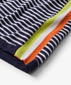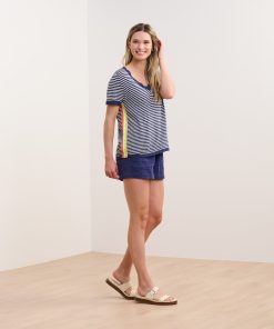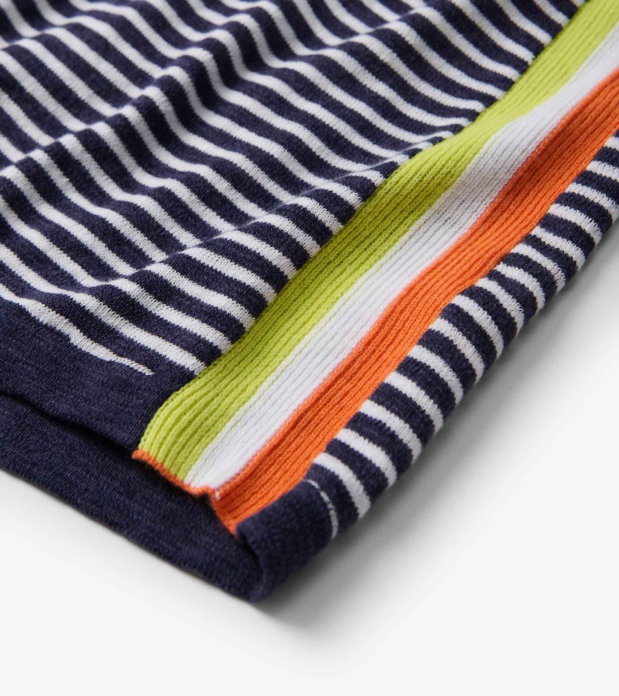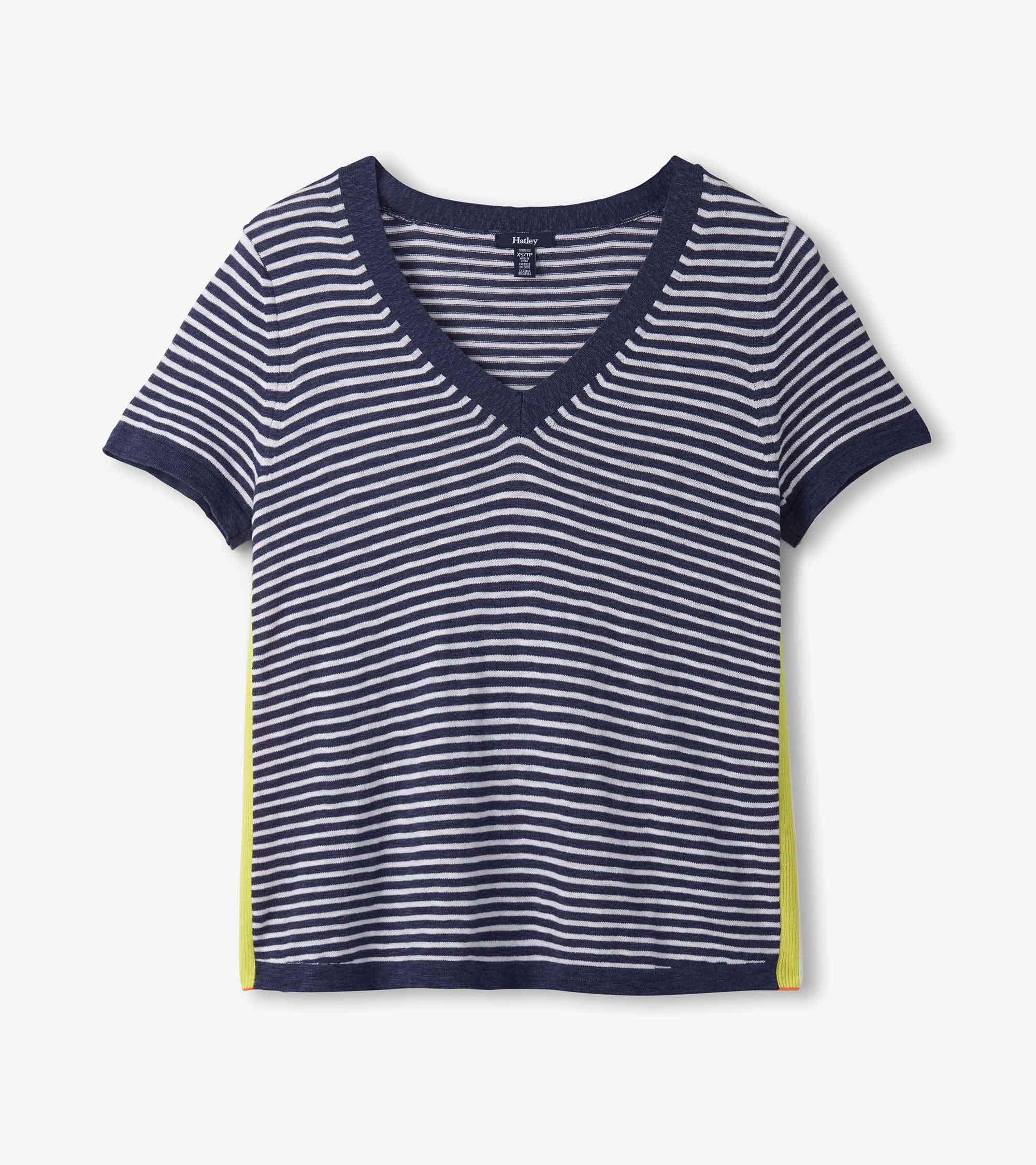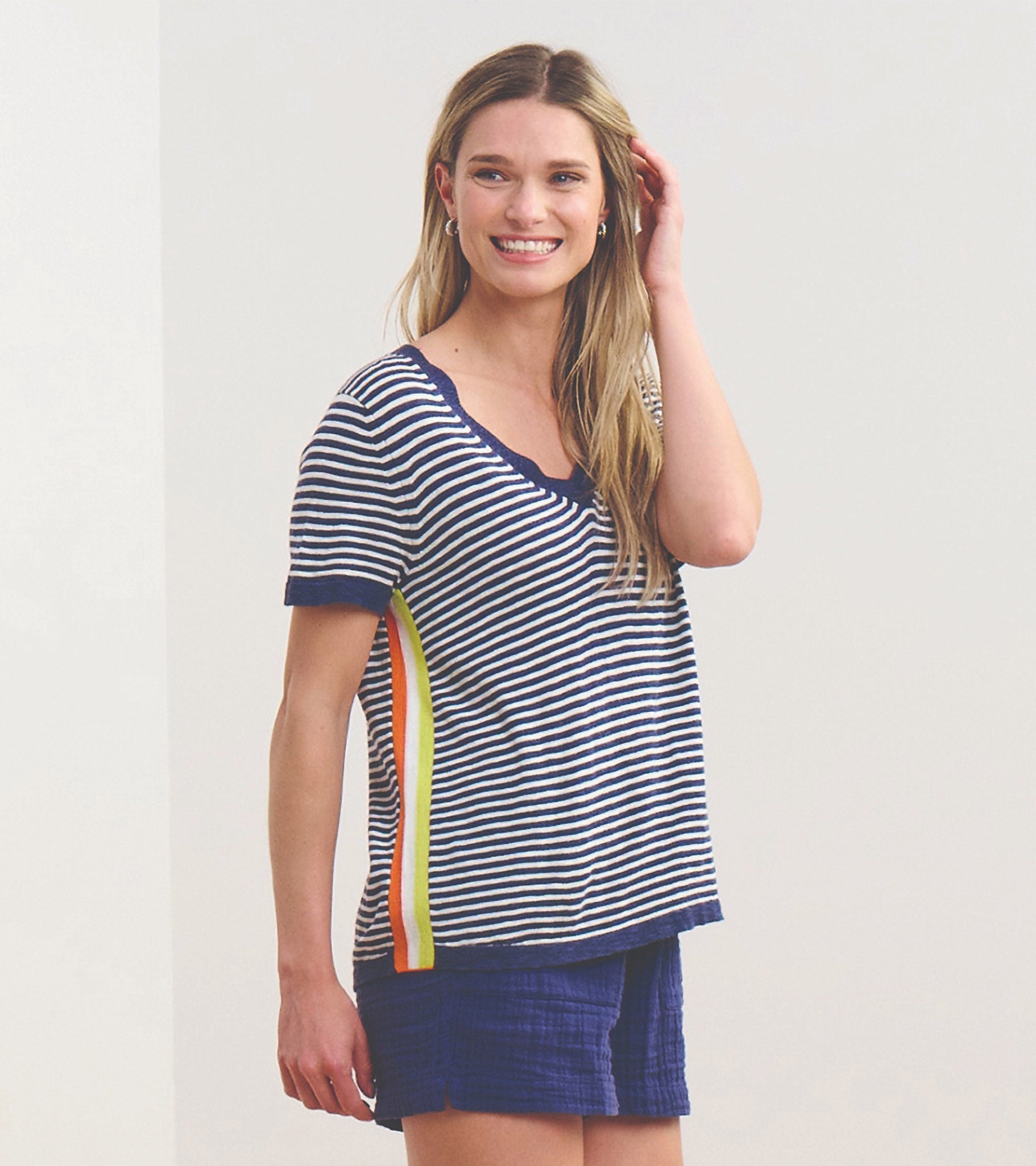The V-Neck Tee in Patriot Blue Stripes is a versatile everyday essential. Made from a blend of cotton and viscose, this fine gauge V-neck knit tee offers lightweight comfort and a flattering fit. The three side stripes on the side and the thin navy stripes on the front and back add a touch of color and nautical charm, perfect for casual outings. Style it with neutral bottoms for a fresh, effortless look.