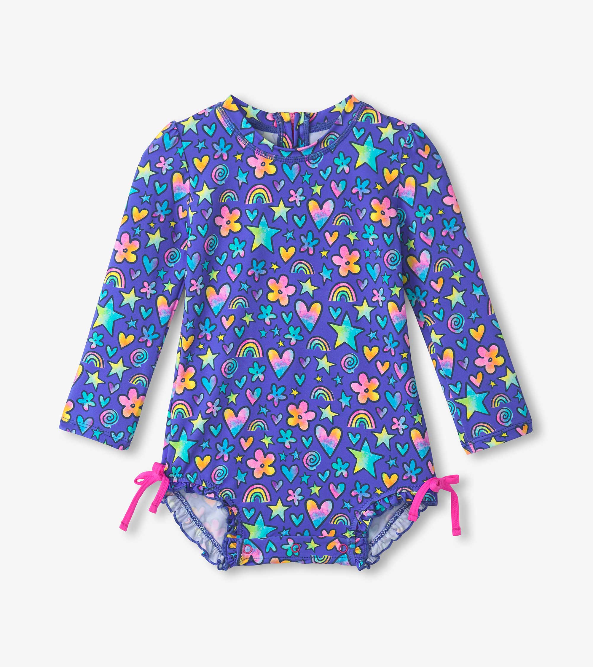 Help your little one express themselves in our baby girls watercolour doodles rashguard swimsuit! Made from soft, sun-protective fabric in amparo blue, this one-piece rash guard features an exposed zipper, long puffed sleeves, and a multicolor doodle pattern. Ruffles and pink bows at the leg openings add a playful touch, while the snap closure at the crotch ensures easy changes.