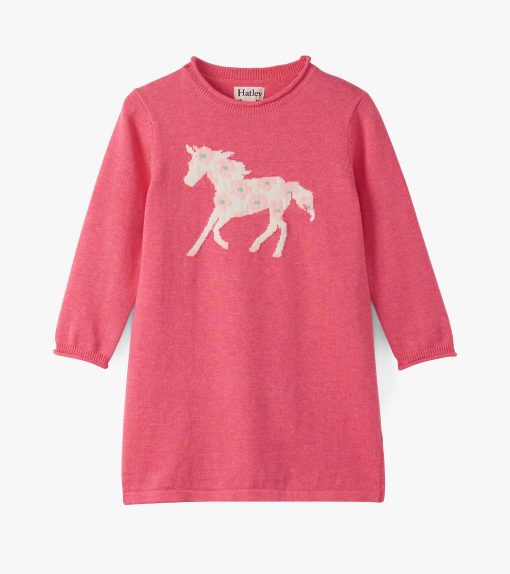 Grace her day with cozy charm in the Baby & Toddler Girls Flower Horse Classic Sweater Dress in Pink! Crafted from 100% cotton yarn, this long-sleeve sweater dress features a straight fit and soft heathered rose-pink background that’s perfect for cooler days. The neckline and sleeves are delicately finished with a jersey roll edge, while two buttons at the back make dressing simple. At the heart of the design, a large white horse silhouette blooms with pink petals and light blue center flowers knitted into the chest, blending warmth, whimsy, and timeless style in one lovely look.