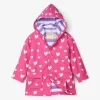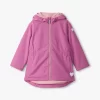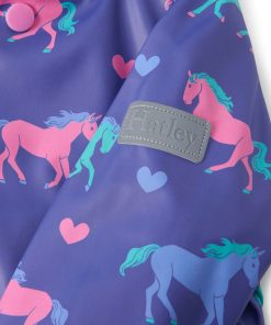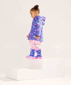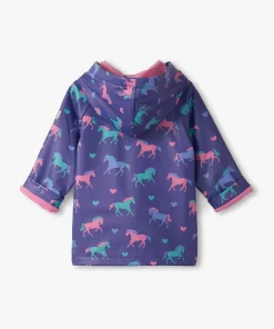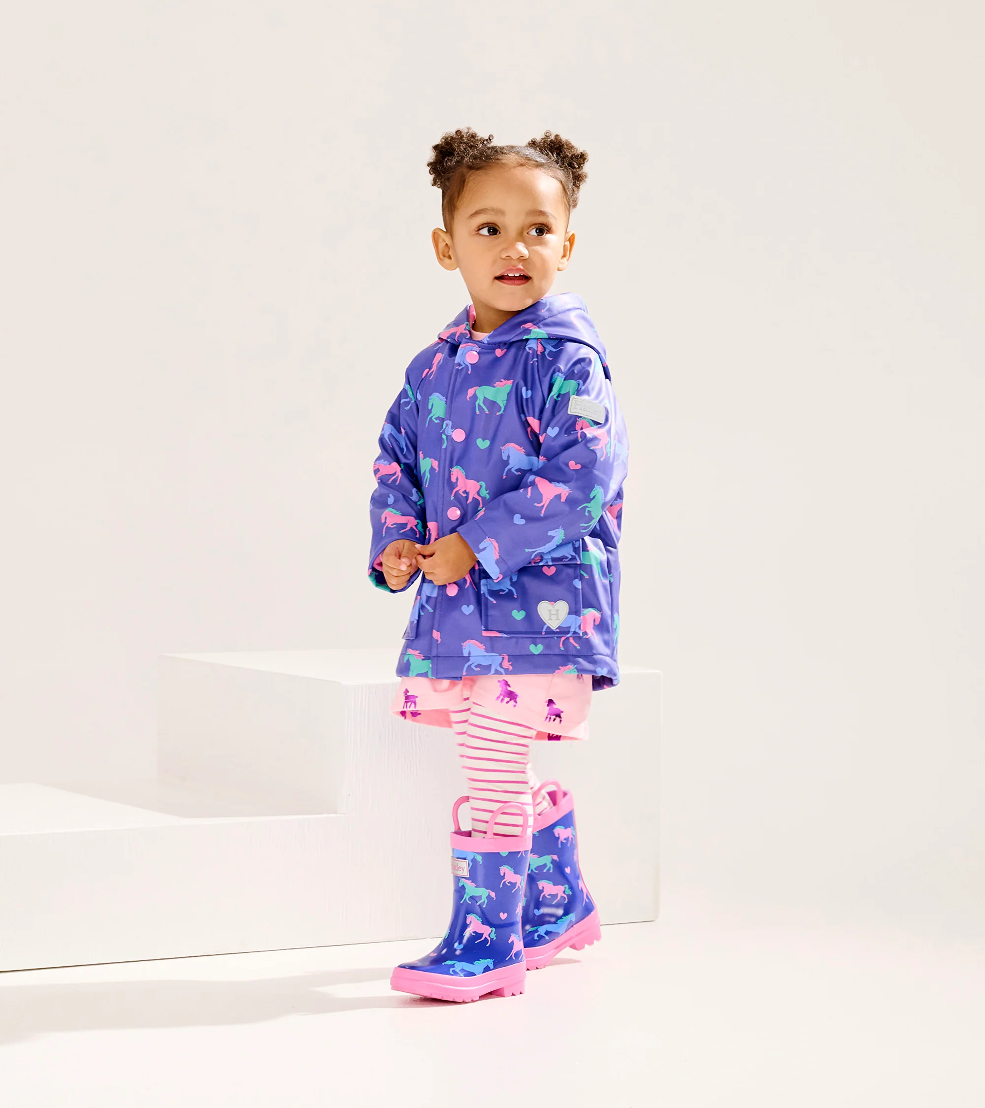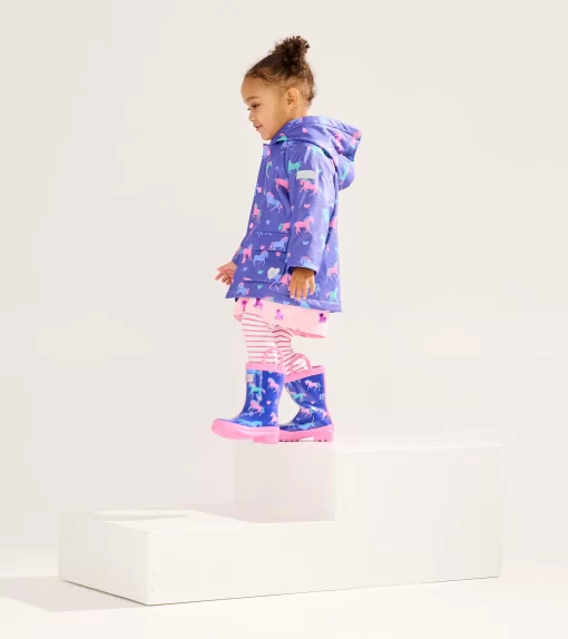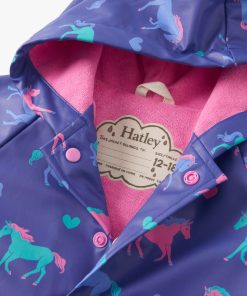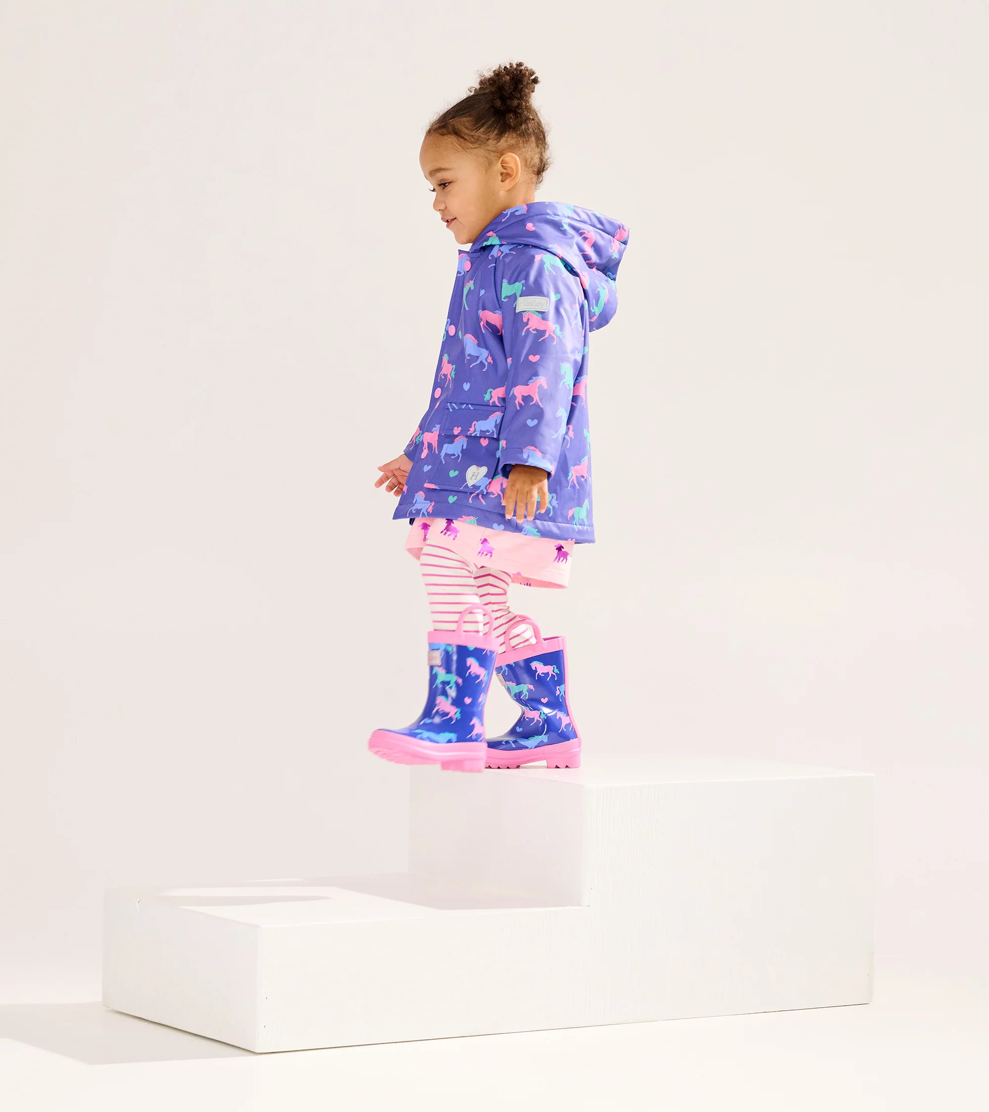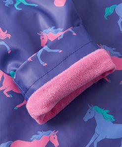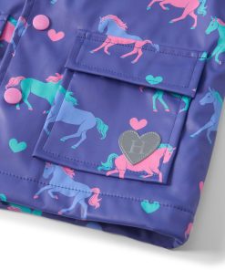 Gallop into puddle season with this enchanting rain jacket, designed in a blueish purple hue and sprinkled with playful prints of blue, teal, and pink horses dancing among teal and pink hearts. Its soft pink, fully lined interior adds a cozy touch, while pink snap buttons and flap-covered patch pockets bring function. Crafted with a waterproof polyester shell and PU coating, this jacket keeps little adventurers dry and smiling. Details like a built-in label for handing it down to up to three lucky kids make it as practical as it is magical.
