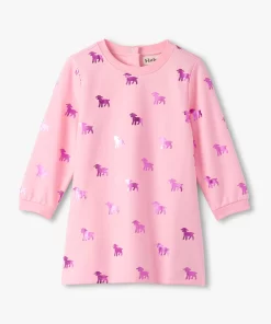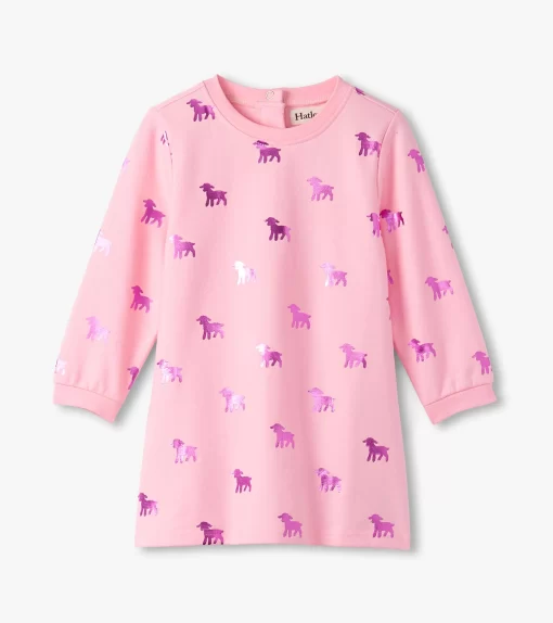 Add a touch of shimmer to her everyday adventures with the Baby & Toddler Girls Lamb Silhouette Dress and Legging Set in Pink! This charming set includes a heathered pink long-sleeve dress-style top featuring a classic crew neck, cuffed wrists, a gathered empire seam at the back, and a two-button opening at the neck for easy dressing. The all-over print of shiny metallic holographic purple lambs brings a playful sparkle to her look. Paired with comfy white and pink horizontal-striped leggings made from a soft and stretchy cotton blend and finished with an elastic waistband, this outfit blends comfort with whimsy.
