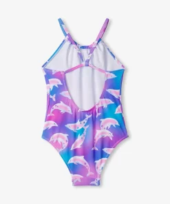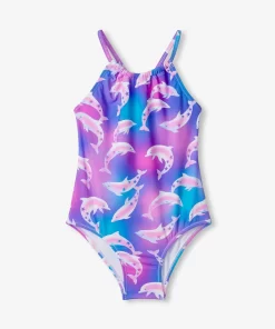 Swim into whimsy with the Girls Airbrush Dolphins Gather Front Swimsuit! The vibrant dolphin design and ruched front add an extra splash of charm, while the durable, comfy fabric keeps her ready for every cannonball and beach adventure.