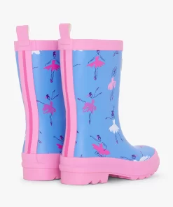 Help her dance through the puddles with the Girls Ballet School Matte Rain Boots in Blue! Handmade from waterproof vulcanized rubber with a soft matte finish, these boots feature a charming ballet-inspired print of dancing women in flowing dresses, accented by red bows and pink hues. The pink sole and leg opening add a playful contrast, while the double black back stripe and pull tab bring functional flair.