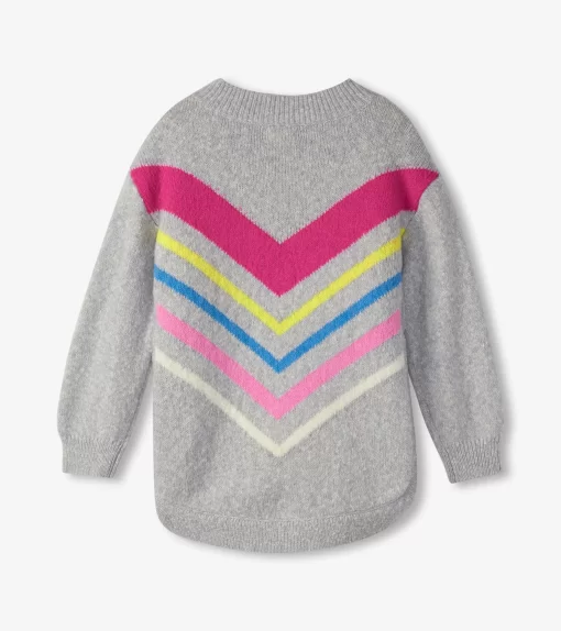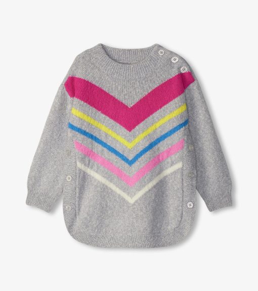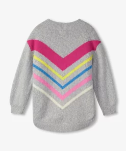 The Girls Chevron Stripe Chunky Sweater Tunic is a stylish and cozy addition to any wardrobe. Made with a blend of acrylic, cotton, and nylon, this tunic features trendy chevron stripes that are perfect for layering and staying snug all day long.