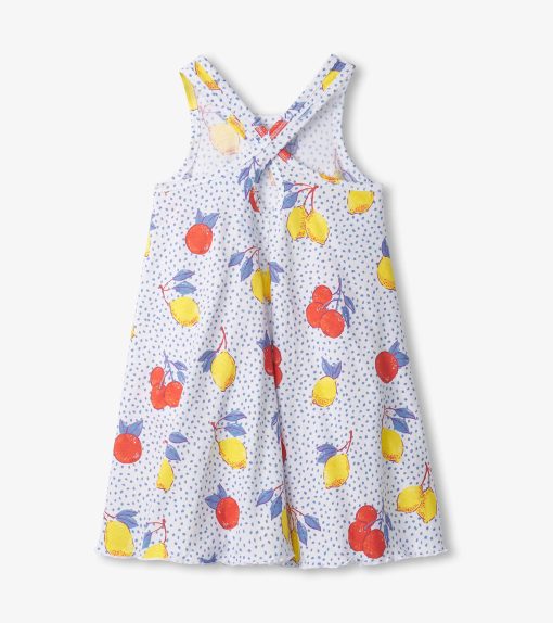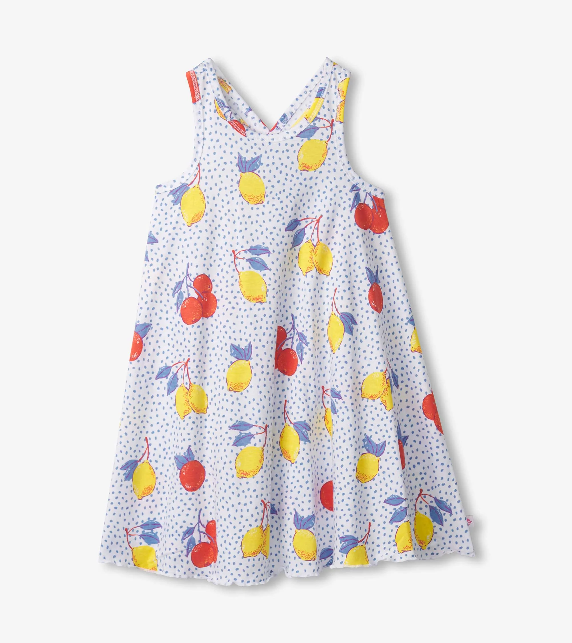 Brighten her wardrobe with the Girls Fresh Citrus Trapeze Dress! Crafted from breathable cotton, this dress features a vibrant citrus pattern and a breezy trapeze silhouette. Perfect for sunny adventures, it offers all-day comfort while keeping her stylish. Add sandals and a sunhat for a cheerful summer outfit!