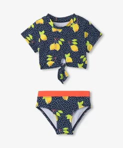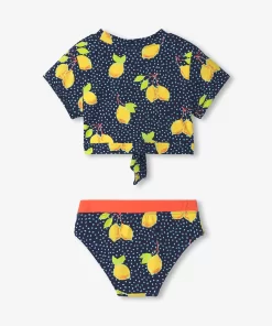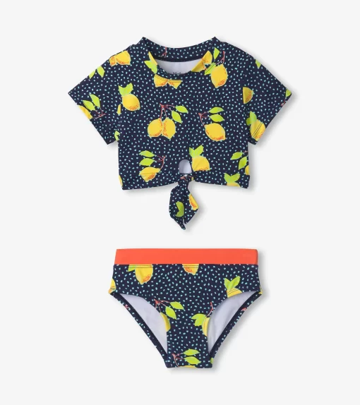 Help your little one stay stylish in our girls fresh lemons short sleeve tankini set! This adorable tankini set features a dark blue color with baby blue polka dots, an all-over lemon design, and a playful orange waistband. Perfect for their next sunny beach day building sand castles!