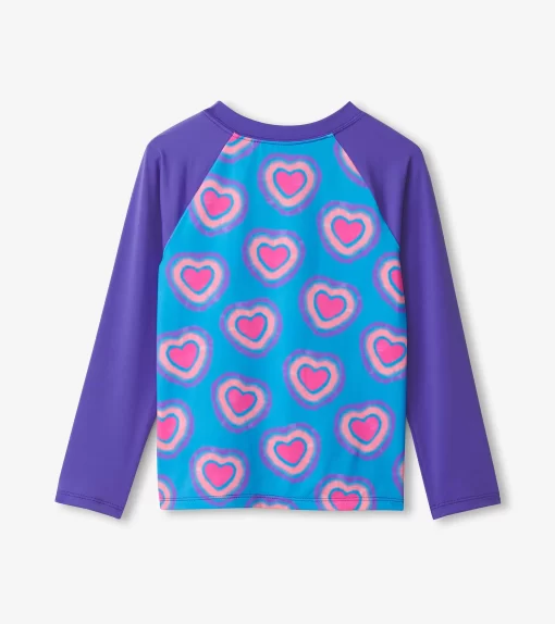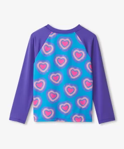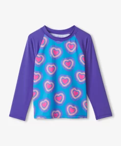 The Girls Glowing Hearts Long Sleeve Rashguard is a bright idea for sunny swim days! With a dazzling heart design and full-sleeve coverage, it offers sun protection and playful style in one perfect package.