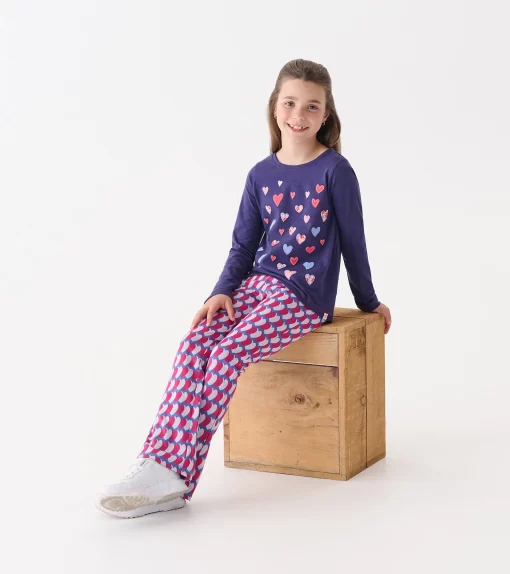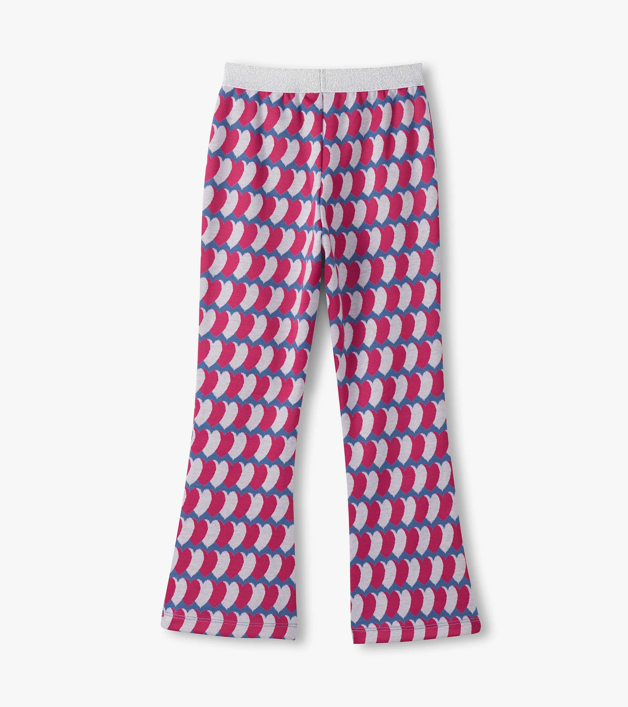 She’ll fall in love with the comfort and sparkle of the Girls Graphic Hearts Fun Waist Flare Pants in Blue! Made from a soft jacquard blend, these pull-on flare pants feature a shiny silver waistband and an all-over pattern of silver and dark red hearts against a cool blue background. The stretchy fabric and fun silhouette make them perfect for any fun occasion.