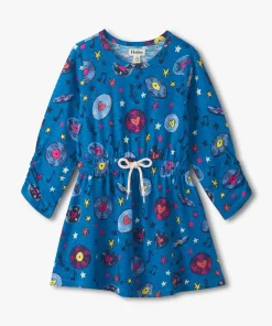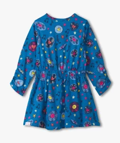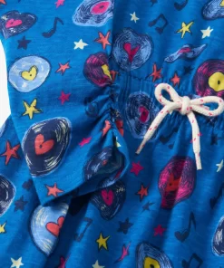 The Girls Love of Music Cinched Waist Dress in Blue hits all the right notes with its soft 100% cotton slub jersey and playful all-over print of vinyl records, hearts, music notes, stars, and butterflies. The heathered blue backdrop brings a dreamy vibe, while the elastic cinched waist with a functional white drawcord adds both comfort and shape. Finished with elastic ruching at the sleeves, this dress strikes a perfect chord between fun, flair, and freedom of movement.
