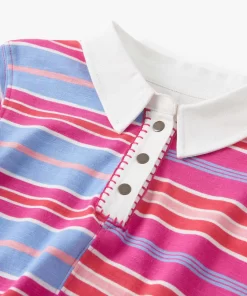 The Girls Mixed Stripes Polo Dress in Pink is a sporty-meets-playful take on the classic rugby look, made from soft 100% cotton slub jersey. With long sleeves, a crisp white woven collar, and three dark grey snap buttons accented by dark pink blanket stitching, it blends polished detail with fun design. The eye-catching colour-block stripe layout, blue dominant on the right, purple on the left, adds visual flair, while dark pink, white, and purple stripes complete the vibrant mix. Finished with elastic cuffed wrists and side hem splits, this dress is made for bold standout style.