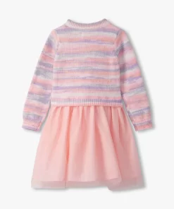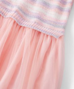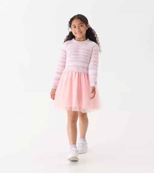 Packed with personality and premium quality, the Girls Pastel Rainbow Fuzzy Mixed Skirt Dress blends a fuzzy knit top with a flowing light pink mesh skirt. The upper sweater is made from soft poly-nylon yarn with cozy cuffed details, side splits, and horizontal pastel stripes in lavender, peach, and light grey. With its fully attached skirt and cambric lining, this dress offers layered warmth and playful movement in one.
