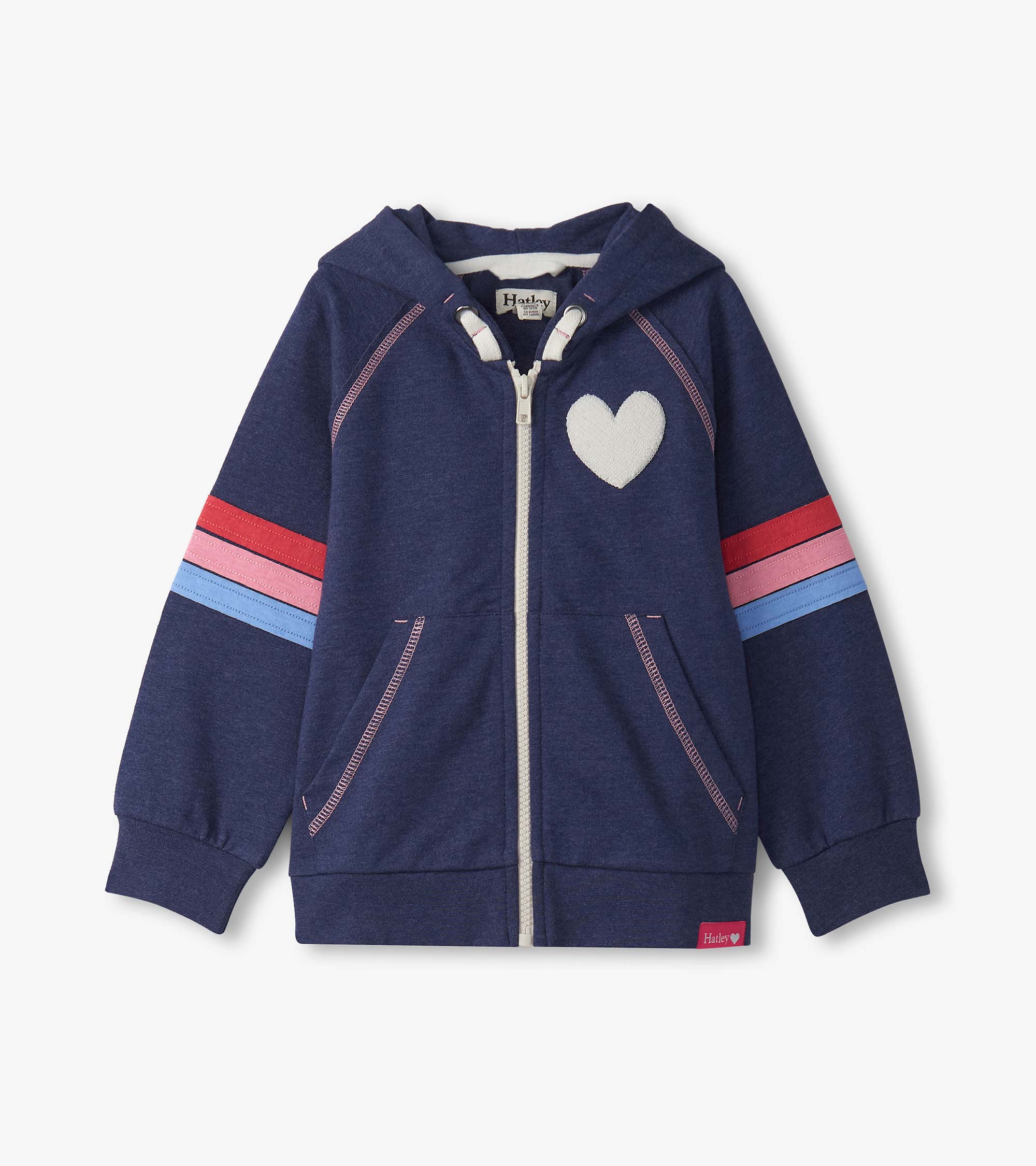 Add a burst of colour and comfort to her wardrobe with the Girls Patriot Blue Zip-Up Hoodie in Blue! Made from lightweight French terry, this hoodie blends everyday ease with standout style. Its rich patriot blue background is accented by playful pink stitching, a white zipper, and matching faux drawcords. A cozy kangaroo pocket and soft, self-lined hood offer functional flair, while the fuzzy white heart on the chest and colourful stitched stripes above the elbows bring sweet, sporty charm to every adventure.