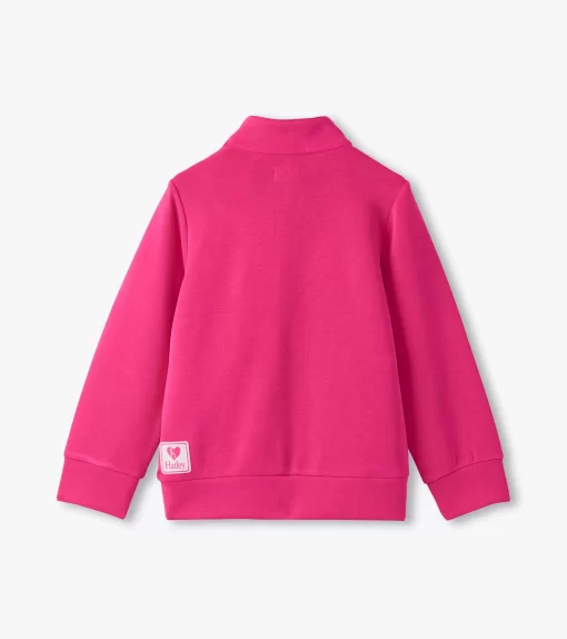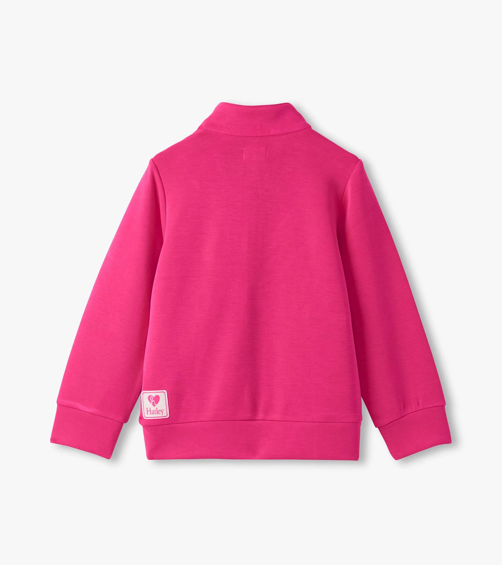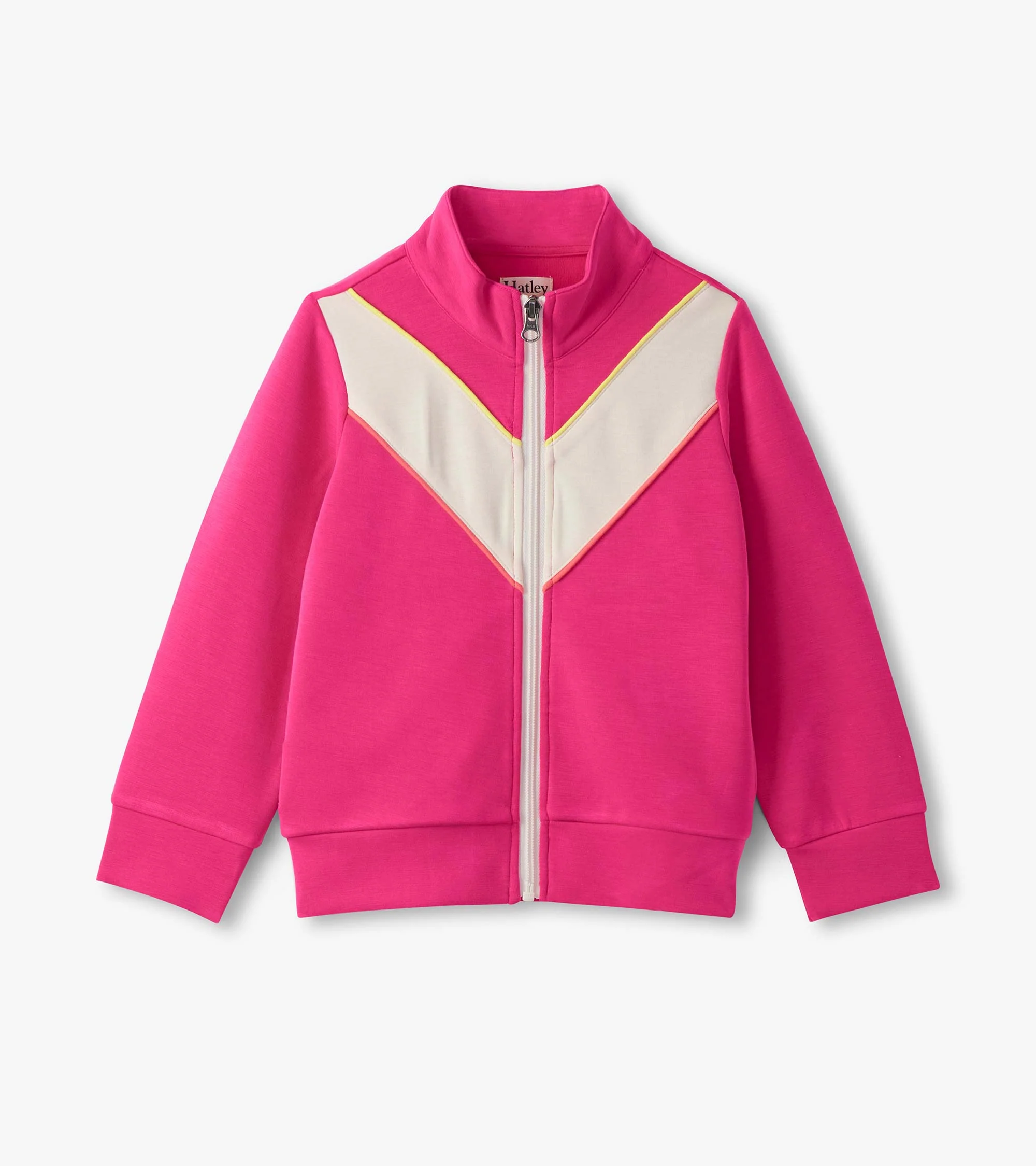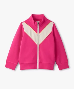 The Girls Pink Athletic Jacket is the perfect blend of function and flair, made from a breathable sandwashed stretch jersey that’s soft, light, and flexible. This full-zip athletic layer features a sporty two-piece collar, chevron front style lines, and set-in long sleeves with thumbhole cuffs for extra coverage. The standout purple zipper with a protective zipper garage adds a bold touch, while side seam pockets offer everyday practicality. Finished with an elastic hem, this jacket is ready to move in style.