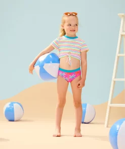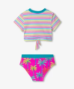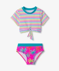 Help your little one paint a picture of paradise with our girls printed palms short sleeve tankini set! This set features fuchsia purple bottoms with a turquoise waistband and a multicolor palm tree pattern, while the top boasts multicolor stripes, a turquoise crewneck, and a tie front detail. The perfect look for their next trip down south!
