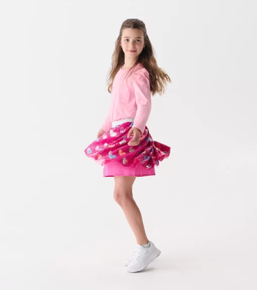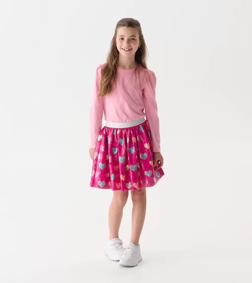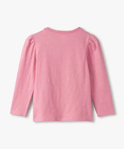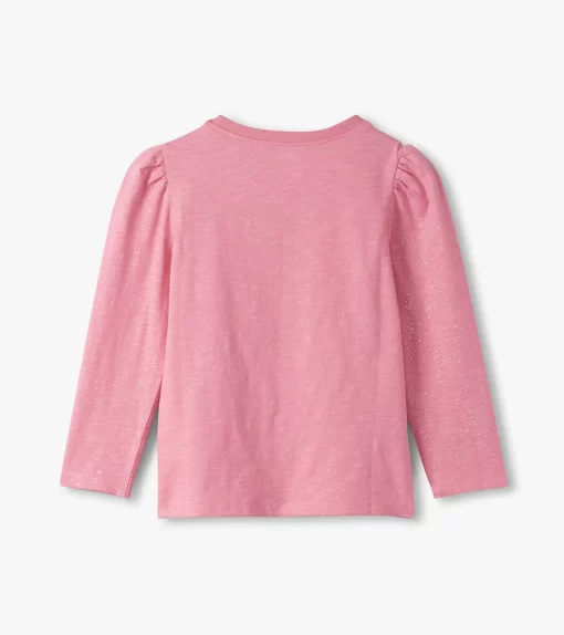 The Girls Sea Pink Sparkle Puff Sleeve Graphic Tee in Pink is a shimmer-packed essential that combines everyday comfort with standout style. Crafted from 100% cotton drapey slub jersey, it features a classic round neckline and long puffed sleeves for that perfect blend of softness and flair. The vibrant sea pink base is drenched in all-over glitter, catching the light with every move and adding a magical sparkle to her day. Whether she’s headed to school or a playdate, this tee brings joyful energy and all-day shine.