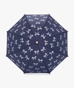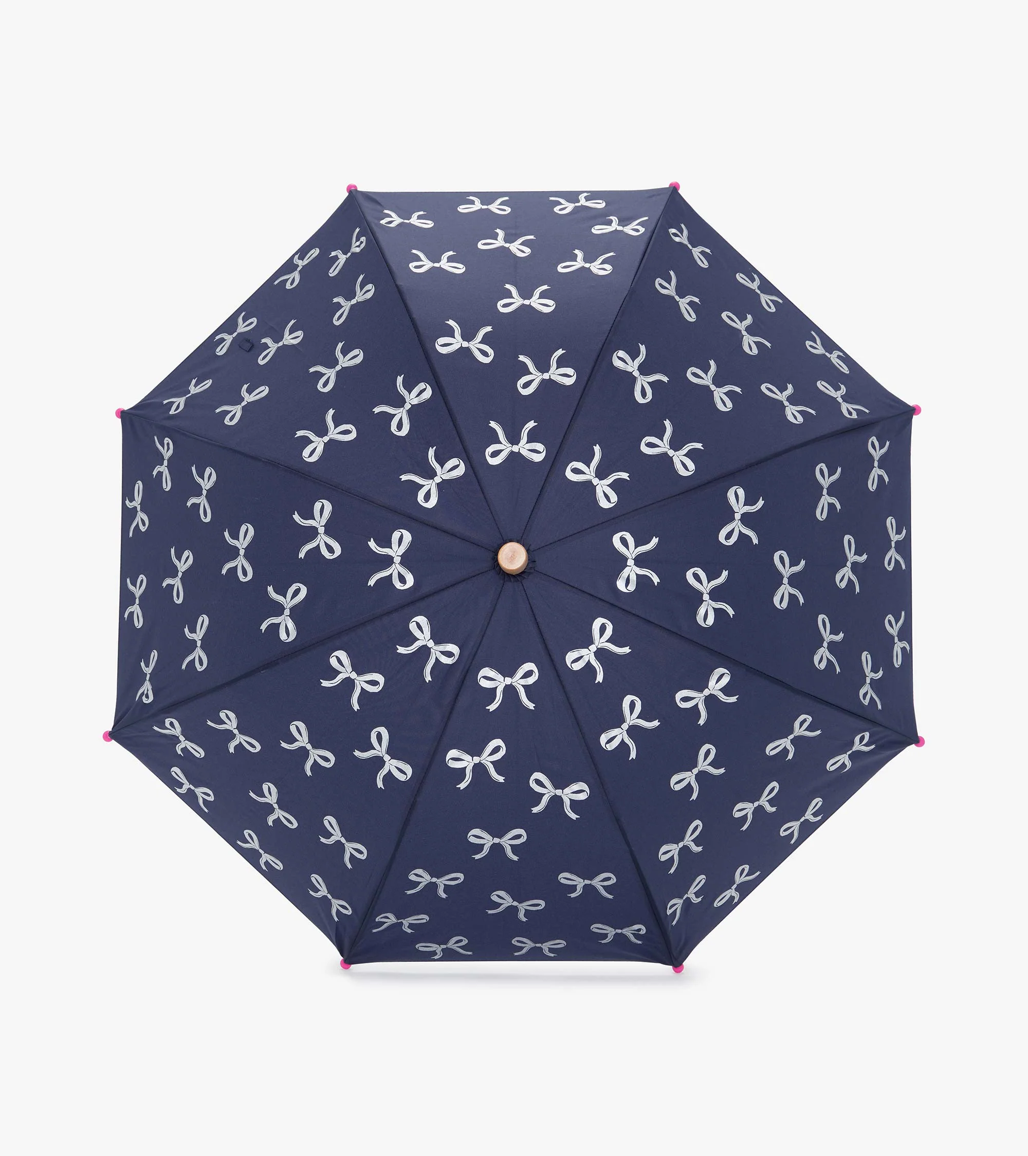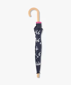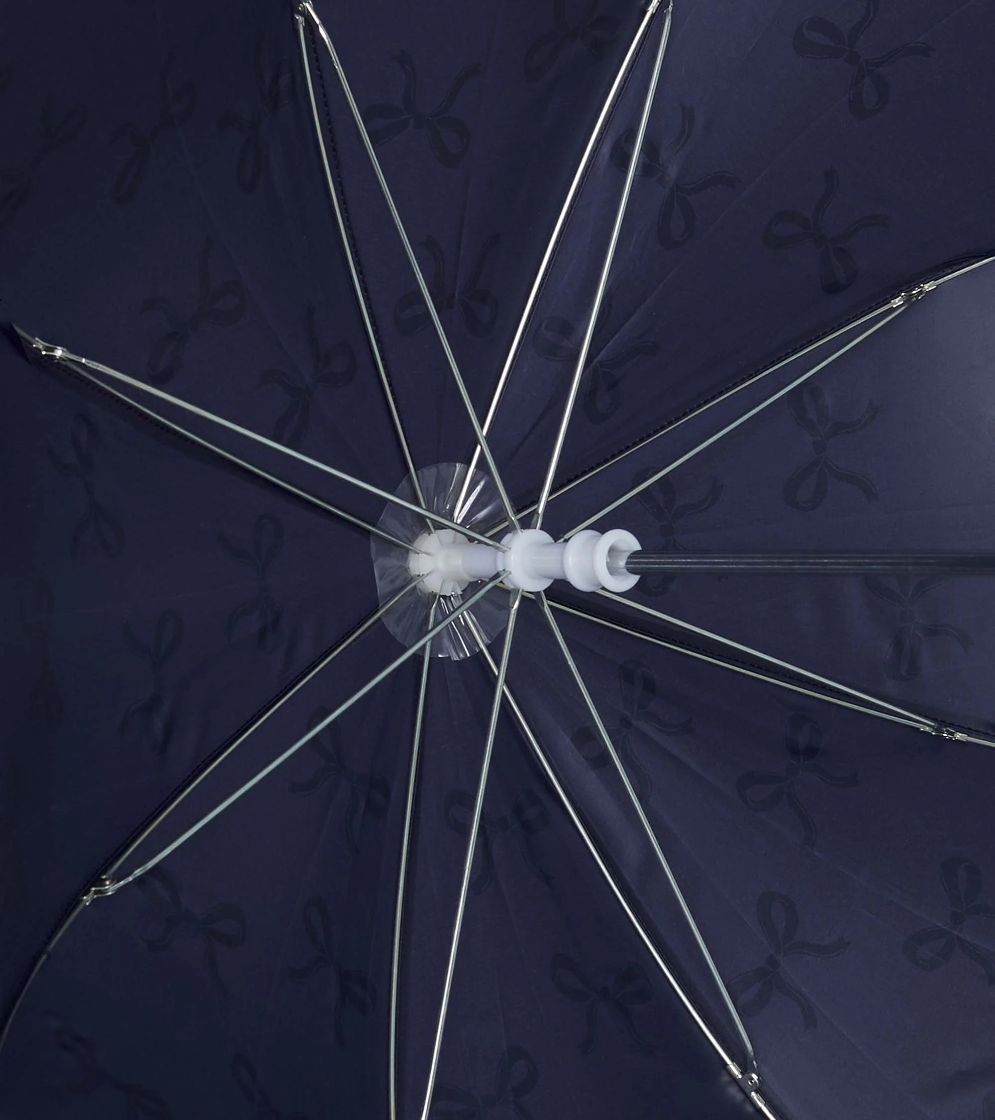 Brighten up rainy days with our Girls Silver Ribbon Umbrella in Blue, crafted from durable 100% polyester. Featuring a dark blue backdrop with a shimmering all-over silver ribbon print, it pairs style with storm-ready function. Finished with a light brown wooden handle and top, pink tips, and a sleek grey shaft, this umbrella makes puddle-jumping feel like a fashion statement.