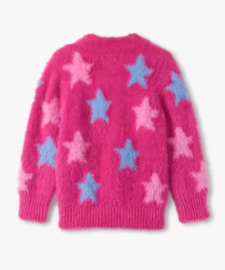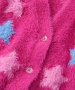 Wrap her in warmth and whimsy with the Girls Sparkling Star Fuzzy Cardigan in Pink! Made from extra fuzzy nylon yarn, this open-front, dark pink cardigan features glitter-filled transparent buttons and a playful knit of blue and light pink stars. The elasticated cuffs and hem add cozy structure to this starry must-have layering piece.