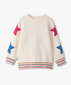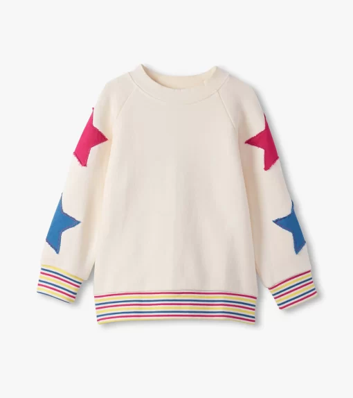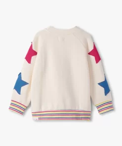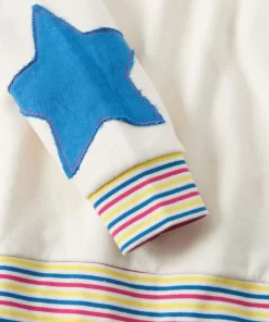 The Girls Star Slouchy Pullover is a celestial-inspired staple made from soft washed French terry cotton in a neutral natural hue. Featuring long raglan sleeves and a round neckline, the standout details are bold star patches in blue and fuchsia on the arms, paired with multicoloured striped cuffs and hem that bring a pop of playful energy.