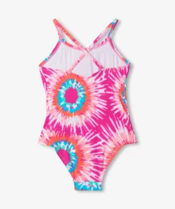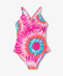 Let your little one make a splash with our girls sunburst tie dye ruched front swimsuit! This flattering one-piece features a ruched front, a vibrant sunburst tie dye pattern, criss-cross back straps, and a cute bow on the chest. Perfect for a fun day with their friends at your local splash pad.