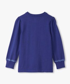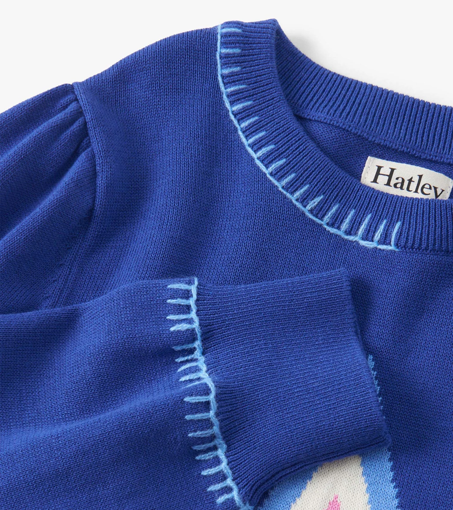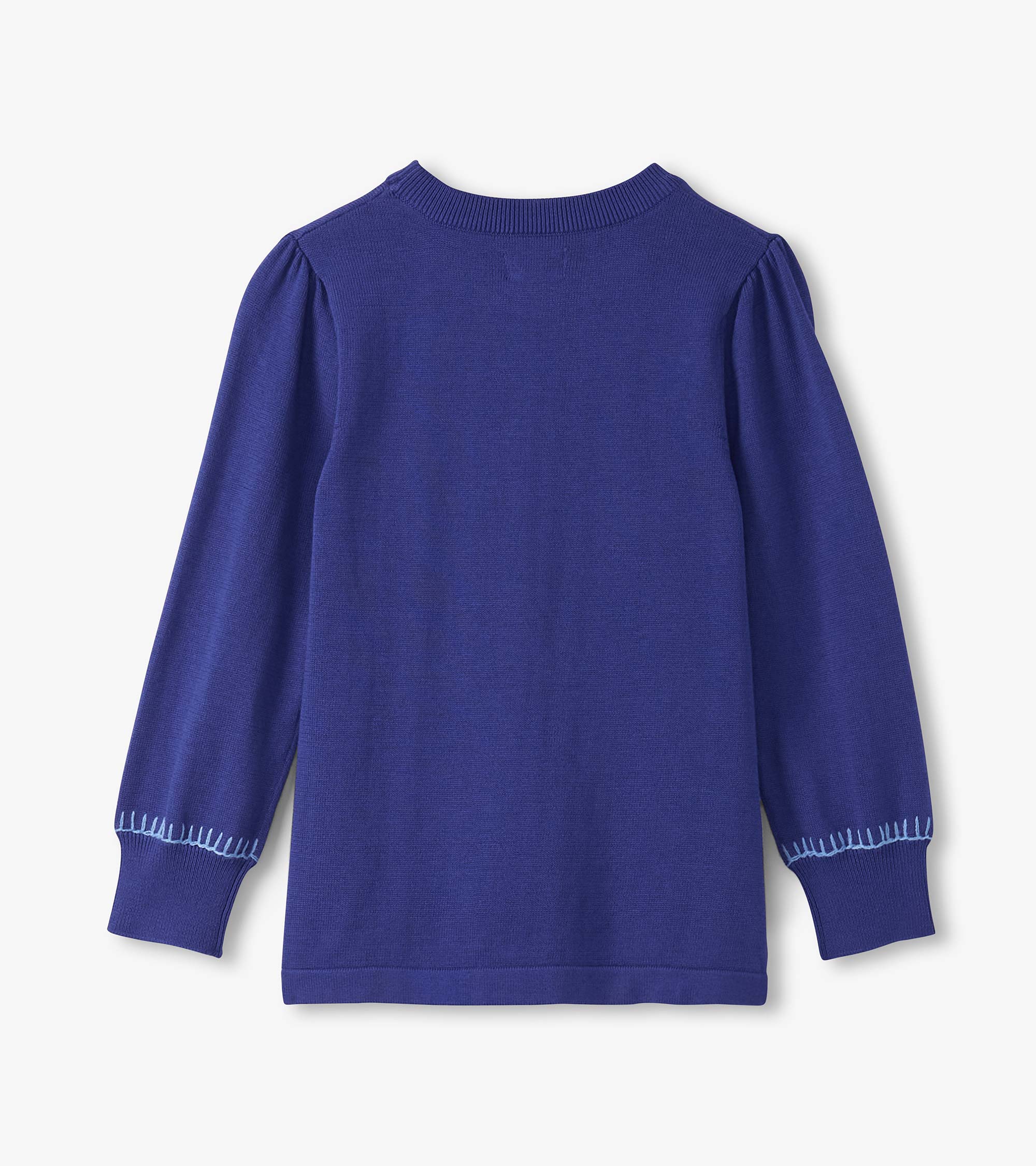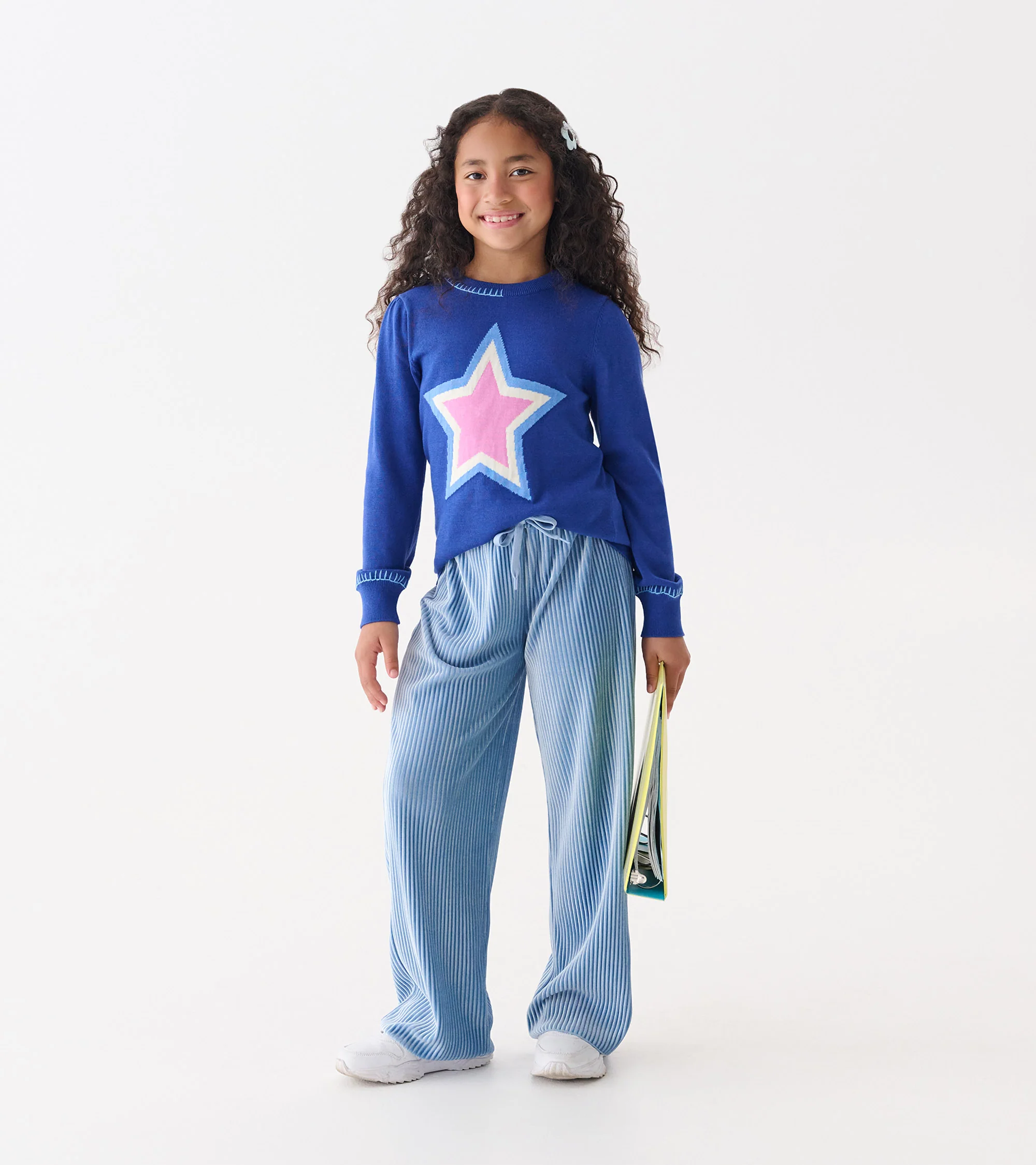 The Girls Super Star Pullover Sweater in Blue is a cozy showstopper made for cooler days and starry vibes. Crafted from 100% cotton yarn, this tunic-length sweater offers softness and warmth with a round neckline and full-length sleeves. Against its dark blue backdrop, a large pink star takes center stage on the chest, radiating with white and light blue knitted outlines. Decorative light blue blanket stitching adds artisanal charm around the neck and wrists, making this pullover a stellar pick for comfort with standout style.