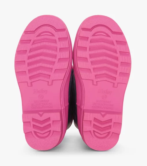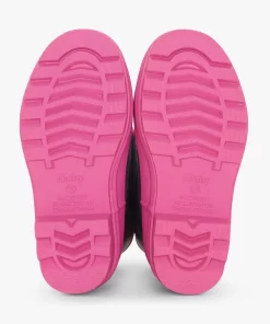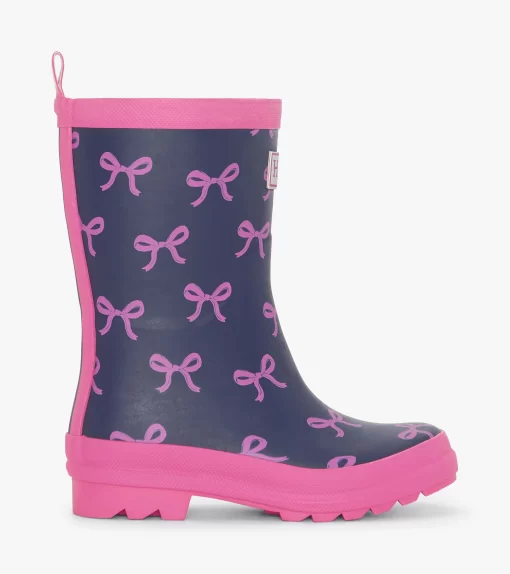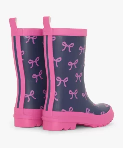 Add charm to grey days with the Girls Teeny Bows Matte Rain Boots in Blue! Handmade from waterproof vulcanized rubber with a soft matte finish, these dark blue boots feature an all-over fuchsia pink bow print and accents at the sole, back stripe, rim, and pull tab.