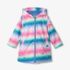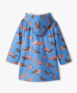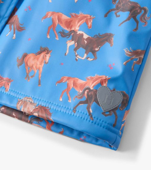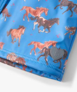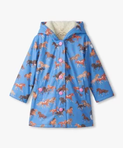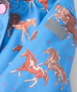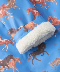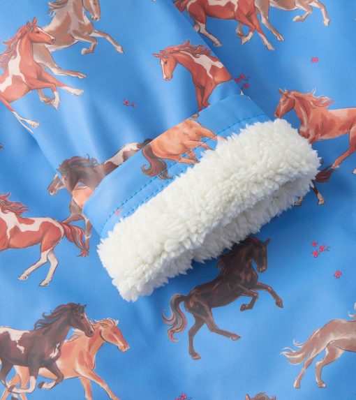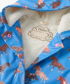 The Girls Tinsel Horses Sherpa Lined Button-Up Rain Jacket in Blue blends whimsical design with cozy function for rainy-day adventures. With an all-over print of galloping light and dark brown horses among delicate pink flowers, it features a soft faux Sherpa lining and a fully lined hood for extra warmth. The blue shell is made from durable PU-coated polyester, while pink snap-button closures and front welt pockets add playful charm and utility. Thoughtful details, such as a name label that accommodates up to three names for easy hand-me-downs, a silver box logo on the sleeve, and a Hatley heart applique, complete this jacket, built to be loved and passed on.