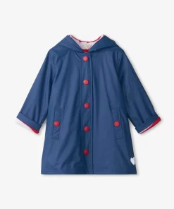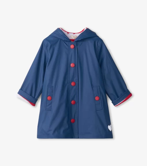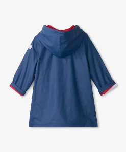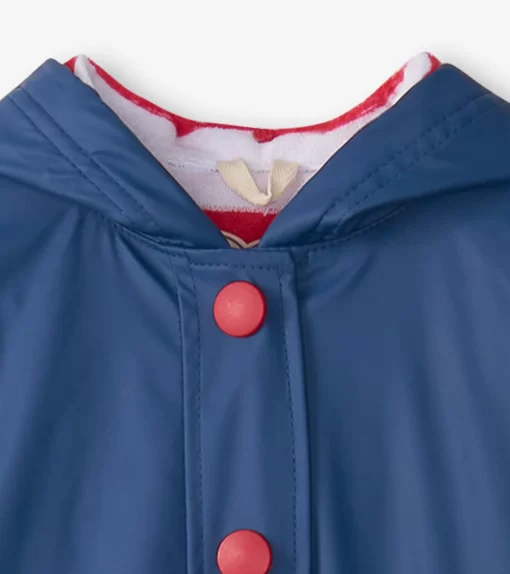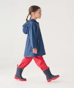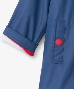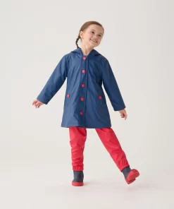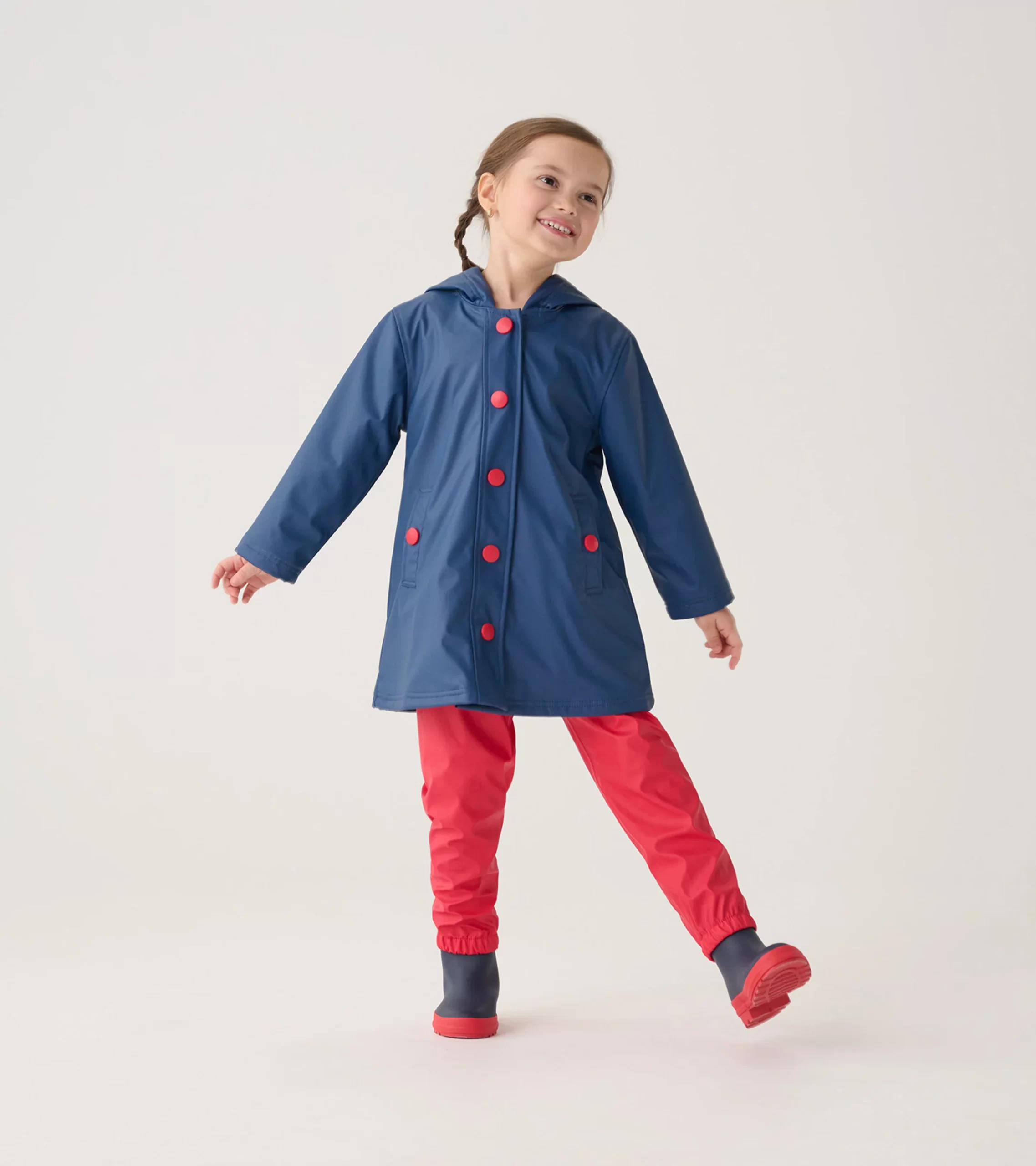 This navy and red water-resistant raincoat is the perfect attire for any rainy day outing! Whether it be for splashing through puddles or dancing in the rain, our PVC-free design offers ultimate splash protection and comfort, while the durable construction ensures long-lasting use.
