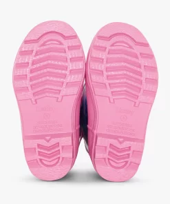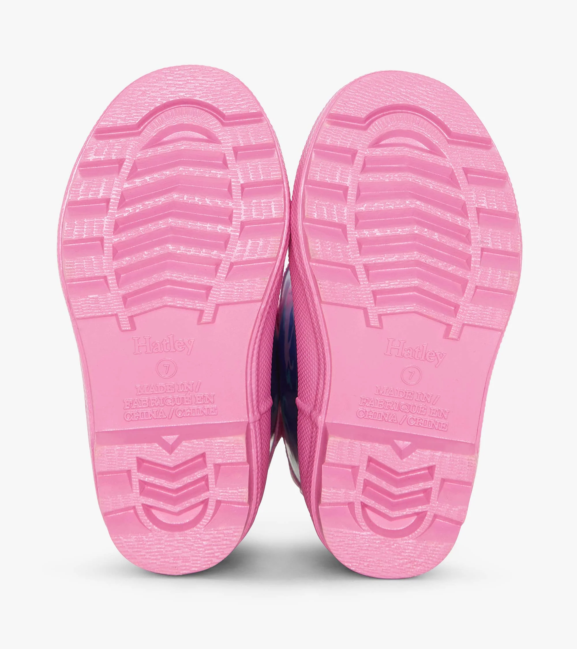 Make every splash a stylish adventure with the Toddler Girls Hearts & Horses Rain Boots in Blue. These handmade vulcanized rubber boots are built for puddle-hopping fun, featuring a waterproof exterior and slip-resistant soles to keep little feet safe and dry. The shiny blue finish is brought to life with a whimsical print of blue, teal, and pink horses, scattered with tiny matching hearts. A light pink sole, striped accents up the back, rim, and boot loops add sweet contrast, while the white-and-pink front logo adds a signature touch. With a removable insole, these boots are perfect for trotting through rainy-day play.