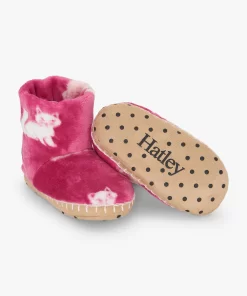 Keep tiny toes toasty in our Girls Little Kitties Fuzzy Fleece Slippers in Pink, made from ultra-soft 100% polyester for all-day warmth. Featuring a cozy slouchy fit and a playful white kitty pattern on dark pink fleece, these slippers charm at every step. The brown micro suede sole with black grip spots and a Hatley logo offers non-slip comfort, while white whip-stitch edging adds a sweet, handcrafted touch.