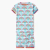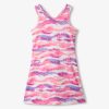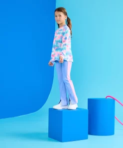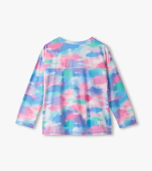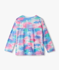 The Girls Sunset Long Sleeve Swing Shirt in White is a breezy activewear top crafted from a soft and stretchy polyester-spandex jersey blend that moves with every step. Featuring a relaxed round neckline and dropped shoulder styling, this long-sleeve shirt flows with a playful swing silhouette. The white backdrop bursts with a vibrant multicoloured watercolour pattern, accented by purple stitching at the armholes and hem.